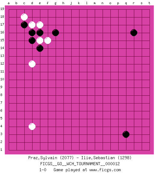 Last move : 1-0 2014 December 13 1:36:15 [Event "FICGS__GO__WCH_TOURNAMENT__000012"] [Site "FICGS"] [Date "2014.11.01"] [Round "1"] [Black "Praz,Sylvain"] [White "Ilie,Sebastian"] [Result "1-0"] [Rating 1 "2077"] [Rating 2 "1298"] 1.r16 d17 2.q3 d4 3.d15 d12 4.g16 e15 5.e14 f15 6.c17 c18 7.d16 e17 8.e16 1-0 This go game has been lost on time (started : 2014.11.01 20:7:3) Here are the names of the openings (joseki) played in the four corners : Corner d16 : d17 d15 Komoku (Somok, Xiao~mu`) 3-4 Point. The komoku (3-4) point is the traditional corner enclosure move.. Ikken Takagakari (Hankan Nop'dakeolch'im, Yi Gaogua`jiao~, 1-Space High Approach). The 5-4 approach move has become more popular in modern times, as modern Go emphasizes speed and influence. Player Black won this Go (weiqi, baduk) game. Follow this game move after move (download)Stop on second, extend on third. (Anonymous) Mandala - that's it! 16x16 squares as multiple of the four and the eight because of the Four Noble Truths and the Noble Eightfold Path. (Heinz-Georg Lehnhoff about Big Chess)