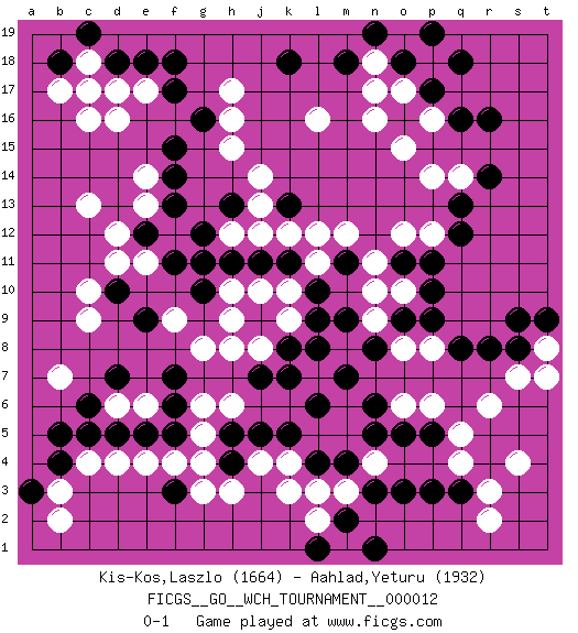 Last move : 0-1 2015 April 23 4:13:15 [Event "FICGS__GO__WCH_TOURNAMENT__000012"] [Site "FICGS"] [Date "2014.11.01"] [Round "1"] [Black "Kis-Kos,Laszlo"] [White "Aahlad,Yeturu"] [Result "0-1"] [Rating 1 "1664"] [Rating 2 "1932"] 1.r16 d4 2.q3 d16 3.p17 q5 4.q8 n4 5.p5 p6 6.o5 q4 7.o3 r3 8.p3 o6 9.n5 s4 10.f3 k4 11.c6 d6 12.d7 e6 13.c5 c4 14.d5 e4 15.e5 f4 16.f5 g4 17.n6 p8 18.p9 o8 19.r8 m8 20.l6 h6 21.k7 j8 22.l9 r6 23.f7 g6 24.f6 m3 25.k8 n10 26.p11 o12 27.o11 n11 28.q13 k10 29.j9 k9 30.j7 h8 31.l10 g8 32.k11 j10 33.l8 l11 34.m11 l12 35.m7 m12 36.n8 c13 37.f17 h17 38.f15 h15 39.f13 e14 40.f14 e17 41.f18 c9 42.e9 d11 43.f11 l16 44.j11 h10 45.h13 j14 46.k13 j13 47.h11 k12 48.g10 h9 49.c17 c16 50.e18 d17 51.d18 c18 52.o9 p12 53.q12 h12 54.g12 j12 55.g11 n17 56.g16 p14 57.o16 h16 58.j5 j4 59.h5 g5 60.h4 h3 61.k5 g3 62.l4 l3 63.m4 s7 64.s8 p18 65.q18 n16 66.o18 o15 67.m18 n18 68.n19 e13 69.e12 d12 70.k18 o17 71.p19 q14 72.r14 n9 73.m9 p16 74.q16 r2 75.n3 k3 76.b18 b17 77.c19 c17 78.b4 b3 79.b5 b7 80.a3 b2 81.d10 c10 82.m2 l2 83.n1 t8 84.t9 t7 85.s9 o10 86.p10 e11 87.l1 f9 0-1 Here are the names of the openings (joseki) played in the four corners : Corner q4 : q3 q5 Komoku (Somok, Xiao~mu`) 3-4 Point. The komoku (3-4) point is the traditional corner enclosure move.. Ikken Takagakari (Hankan Nop'dakeolch'im, Yi Gaogua`jiao~, 1-Space High Approach). The 5-4 approach move has become more popular in modern times, as modern Go emphasizes speed and influence. Corner d4 : d4 f3 Hoshi (Hwajeom, Seongjeom, Xingwei`) 4-4 Point. The star or hoshi (4-4) point, emphasizing influence at the potential expense of territory. Ikken Kakari (Hankan Keolch'im, Yi Gua`jiao~, 1-Space Low Approach). Black 2 is the standard approach move to the 4-4. Player White won this Go (weiqi, baduk) game. Follow this game move after move (download)Keshi is worth as much as an invasion ! (Anonymous) Tree pose grows confidence. It roots me to this world. (Terri Guillemets)