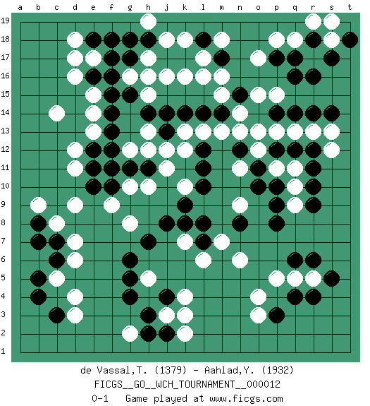Last move : 0-1 2015 June 12 1:6:17 [Event "FICGS__GO__WCH_TOURNAMENT__000012"] [Site "FICGS"] [Date "2014.11.01"] [Round "1"] [Black "de Vassal,Thibault"] [White "Aahlad,Yeturu"] [Result "0-1"] [Rating 1 "1379"] [Rating 2 "1932"] 1.q4 d16 2.q16 d4 3.r10 o3 4.r6 k4 5.c6 o17 6.r14 k16 7.m17 m16 8.k17 l17 9.l18 l16 10.j17 m18 11.f17 e17 12.f16 c14 13.b4 d6 14.c7 d7 15.g4 c8 16.b8 c5 17.b5 b9 18.b7 d9 19.c3 d3 20.g6 h5 21.g5 g8 22.h7 k7 23.j8 h10 24.k8 m7 25.l7 l6 26.l8 n6 27.p3 o4 28.f14 n9 29.l11 h12 30.f12 e13 31.f13 q5 32.r4 j16 33.h16 r5 34.s5 h15 35.g15 h17 36.h18 g16 37.g17 h16 38.h14 k12 39.l12 l13 40.q6 e15 41.f15 j18 42.g11 k10 43.l10 g10 44.h11 j11 45.f10 f9 46.e16 d17 47.e18 d18 48.f18 h19 49.g18 k18 50.e10 d11 51.e12 d12 52.j13 h13 53.k14 k13 54.l14 m13 55.m14 n14 56.k9 o13 57.e11 g12 58.f11 e14 59.j14 j12 60.n15 o15 61.n12 n13 62.o11 p11 63.p10 q11 64.p14 m15 65.p17 q10 66.p9 q9 67.p8 o12 68.n8 n11 69.o10 p5 70.p12 p13 71.q12 q13 72.r12 r13 73.r11 s12 74.r9 r17 75.r16 p18 76.q17 q18 77.r18 s18 78.s17 g2 79.h3 k2 80.j2 j3 81.j4 k3 82.h2 r19 83.s14 s13 84.t18 s19 85.q14 p15 0-1 Here are the names of the openings (joseki) played in the four corners : Corner q4 : q4 o3 Hoshi (Hwajeom, Seongjeom, Xingwei`) 4-4 Point. The star or hoshi (4-4) point, emphasizing influence at the potential expense of territory. Ikken Kakari (Hankan Keolch'im, Yi Gua`jiao~, 1-Space Low Approach). White 2 is the standard approach move to the 4-4. Corner d4 : d4 c6 Hoshi (Hwajeom, Seongjeom, Xingwei`) 4-4 Point. The star or hoshi (4-4) point, emphasizing influence at the potential expense of territory. Ikken Kakari (Hankan Keolch'im, Yi Gua`jiao~, 1-Space Low Approach). Black 2 is the standard approach move to the 4-4. Corner q16 : q16 o17 Hoshi (Hwajeom, Seongjeom, Xingwei`) 4-4 Point. The star or hoshi (4-4) point, emphasizing influence at the potential expense of territory. Ikken Kakari (Hankan Keolch'im, Yi Gua`jiao~, 1-Space Low Approach). White 2 is the standard approach move to the 4-4. Corner d16 : d16 j17 Hoshi (Hwajeom, Seongjeom, Xingwei`) 4-4 Point. The star or hoshi (4-4) point, emphasizing influence at the potential expense of territory. Player White won this Go (weiqi, baduk) game. Follow this game move after move (download)The game plays itself, the players don't control it. (Pierre Audouard) The message for business people contemplating their place in the cyberspace is simple and direct: get linked or get lost. (Vic Sussman and Kenan Pollack)
