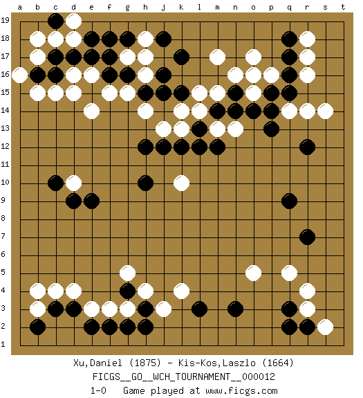 Last move : 1-0 2014 December 7 11:44:51 [Event "FICGS__GO__WCH_TOURNAMENT__000012"] [Site "FICGS"] [Date "2014.11.01"] [Round "1"] [Black "Xu,Daniel"] [White "Kis-Kos,Laszlo"] [Result "1-0"] [Rating 1 "1875"] [Rating 2 "1664"] 1.q16 d4 2.q3 d16 3.q9 k4 4.k17 r14 5.r12 r17 6.q17 r16 7.q15 s14 8.p13 g17 9.k15 d10 10.c16 c15 11.d17 e16 12.b16 b15 13.e18 c18 14.c17 b18 15.g18 h18 16.f18 h17 17.c19 d18 18.e17 d19 19.f16 f15 20.e15 d15 21.f17 g15 22.g16 h16 23.h15 e14 24.j16 h14 25.j15 a16 26.j18 b17 27.h10 q5 28.n3 r3 29.r2 r4 30.c3 c4 31.d3 e3 32.e2 f3 33.f2 g3 34.g2 b3 35.b2 b4 36.h3 h4 37.g4 j3 38.h2 g5 39.e9 k10 40.h12 j13 41.j12 k13 42.k12 m13 43.l13 l14 44.l12 k14 45.m12 o15 46.m14 q14 47.p14 m15 48.n14 l15 49.n15 n16 50.o16 m17 51.q18 r18 52.d9 n13 53.o14 o17 54.r7 s2 55.q2 o5 56.l3 p16 57.p15 o16 58.c10 1-0 Here are the names of the openings (joseki) played in the four corners : Corner q16 : q16 r14 Hoshi (Hwajeom, Seongjeom, Xingwei`) 4-4 Point. The star or hoshi (4-4) point, emphasizing influence at the potential expense of territory. Ikken Kakari (Hankan Keolch'im, Yi Gua`jiao~, 1-Space Low Approach). White 2 is the standard approach move to the 4-4. Corner d4 : d4 c3 Hoshi (Hwajeom, Seongjeom, Xingwei`) 4-4 Point. The star or hoshi (4-4) point, emphasizing influence at the potential expense of territory. Player Black won this Go (weiqi, baduk) game. Follow this game move after move (download)Against three in a row, play right in the center. (Anonymous) It's not the will to win, but the will to prepare to win that makes the difference. (Bear Bryant)
