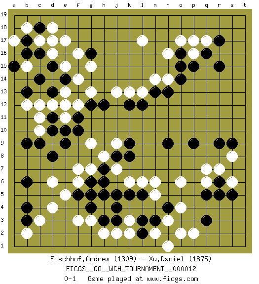 Last move : 0-1 2014 December 31 1:51:39 [Event "FICGS__GO__WCH_TOURNAMENT__000012"] [Site "FICGS"] [Date "2014.11.01"] [Round "1"] [Black "Fischhof,Andrew"] [White "Xu,Daniel"] [Result "0-1"] [Rating 1 "1309"] [Rating 2 "1875"] 1.q16 d4 2.q3 d16 3.r9 o17 4.o16 n16 5.o15 q17 6.r17 p16 7.p15 p17 8.r15 l17 9.c14 c12 10.e14 f16 11.d11 d12 12.e12 c11 13.d10 c10 14.c9 d9 15.b9 e13 16.d13 e11 17.e10 f12 18.f11 e12 19.f10 f14 20.d8 k3 21.e9 f3 22.q5 n3 23.b4 c3 24.b3 b2 25.b16 c17 26.b17 b18 27.b13 b12 28.c16 d17 29.d15 b15 30.a15 a17 31.f15 g15 32.e16 e15 33.c18 d18 34.f15 e17 35.g16 e15 36.g12 g13 37.h12 r7 38.r6 s6 39.s5 q6 40.r5 q7 41.p9 o6 42.n9 m14 43.n13 s8 44.s9 o4 45.m13 l13 46.l12 k13 47.k12 n14 48.o14 j13 49.j5 f6 50.f5 e5 51.g5 d6 52.b6 h4 53.h5 g7 54.g6 f7 55.h7 h8 56.j8 j7 57.h6 j9 58.k8 g9 59.k9 k6 60.k5 l6 61.l5 m6 62.l3 k2 63.l2 p2 64.g4 g3 65.h3 h2 66.j3 j2 67.j4 m5 68.n2 o2 69.m3 n1 70.n4 m2 0-1 Here are the names of the openings (joseki) played in the four corners : Corner q16 : q16 o17 Hoshi (Hwajeom, Seongjeom, Xingwei`) 4-4 Point. The star or hoshi (4-4) point, emphasizing influence at the potential expense of territory. Ikken Kakari (Hankan Keolch'im, Yi Gua`jiao~, 1-Space Low Approach). White 2 is the standard approach move to the 4-4. Corner d16 : d16 c14 Hoshi (Hwajeom, Seongjeom, Xingwei`) 4-4 Point. The star or hoshi (4-4) point, emphasizing influence at the potential expense of territory. Ikken Kakari (Hankan Keolch'im, Yi Gua`jiao~, 1-Space Low Approach). Black 2 is the standard approach move to the 4-4. Corner d4 : d4 c9 Hoshi (Hwajeom, Seongjeom, Xingwei`) 4-4 Point. The star or hoshi (4-4) point, emphasizing influence at the potential expense of territory. Player White won this Go (weiqi, baduk) game. Follow this game move after move (download)Answer the keima with a kosumi. (Anonymous) CHESS, n. f. [echecs, Fr.] A nice and abstruse game, in which two sets of puppets are moved in opposition to each other. (Dr Samuel Johnson, A Dictionary Of The English Language, 1755)