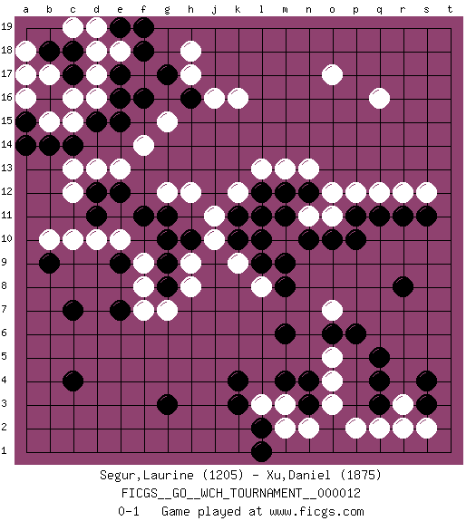 Last move : 0-1 2015 April 28 13:33:57 [Event "FICGS__GO__WCH_TOURNAMENT__000012"] [Site "FICGS"] [Date "2014.11.01"] [Round "1"] [Black "Segur,Laurine"] [White "Xu,Daniel"] [Result "0-1"] [Rating 1 "1205"] [Rating 2 "1875"] 1.c4 q16 2.q5 d16 3.g3 c10 4.r8 r12 5.m4 k16 6.s11 s12 7.c7 e10 8.r11 q12 9.p10 o11 10.p11 p12 11.o10 n11 12.n10 r3 13.s4 o3 14.s3 m3 15.k3 l3 16.k4 o5 17.m6 o7 18.m8 r2 19.n4 o4 20.n3 n2 21.l2 m2 22.l1 p2 23.q4 s2 24.q3 q2 25.p6 d17 26.b9 b10 27.o6 o17 28.m11 n13 29.m12 m13 30.n12 o12 31.q11 k12 32.h10 h12 33.g11 g12 34.f11 e13 35.e12 d13 36.d11 d10 37.d12 c12 38.c14 c13 39.d15 c16 40.e15 f14 41.f16 h17 42.f18 e18 43.g17 h18 44.h16 j16 45.b14 b15 46.e17 d18 47.b18 b17 48.c18 a17 49.a15 a16 50.e19 c19 51.a14 c15 52.f19 d19 53.c17 a18 54.e16 g15 55.l12 l13 56.k11 m10 57.l11 j11 58.k10 j10 59.l9 k9 60.l10 l8 61.m9 h9 62.g9 h8 63.g8 g7 64.e7 f8 65.e9 f9 66.g10 f7 0-1 Here are the names of the openings (joseki) played in the four corners : Player White won this Go (weiqi, baduk) game. Follow this game move after move (download)Empty triangles are bad. (Anonymous) Wisdom begins at the end. (Daniel Webster)