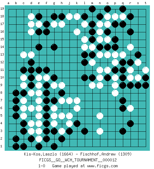Last move : 1-0 2014 December 31 1:51:7 [Event "FICGS__GO__WCH_TOURNAMENT__000012"] [Site "FICGS"] [Date "2014.11.01"] [Round "1"] [Black "Kis-Kos,Laszlo"] [White "Fischhof,Andrew"] [Result "1-0"] [Rating 1 "1664"] [Rating 2 "1309"] 1.r16 d16 2.q3 d4 3.p17 r6 4.r4 r10 5.f3 c6 6.k4 k16 7.c11 c13 8.c8 e3 9.f4 r14 10.f17 e17 11.f16 n17 12.p15 n15 13.r12 q13 14.q12 p13 15.p11 p10 16.o10 o11 17.q10 p9 18.q9 p8 19.r9 s10 20.s9 s12 21.s13 r11 22.t10 t11 23.t9 p12 24.q11 n11 25.q7 n9 26.o14 n13 27.n14 g17 28.g18 h17 29.e18 d18 30.e16 d17 31.e14 d13 32.h18 j18 33.g14 m14 34.m13 m12 35.l13 n3 36.l3 n5 37.q6 k6 38.c3 e2 39.b5 e6 40.b6 c7 41.b7 d8 42.d9 c9 43.b8 e9 44.d10 e7 45.f8 e8 46.m10 m9 47.l10 n10 48.l12 o13 49.j6 k7 50.h8 j7 51.h6 h7 52.g7 g6 53.f6 g5 54.f5 j5 55.f7 c2 56.b2 d3 57.c4 c5 58.c1 g2 59.f2 f1 60.h4 h5 61.h2 j4 62.j3 g4 63.g3 h3 64.g1 e5 65.g10 f10 66.f11 g9 67.f9 e10 68.e11 d1 69.d2 d11 70.d12 c2 71.b1 h9 72.e1 c10 73.d11 e4 74.d2 d6 75.m15 o15 76.p14 l14 77.m16 o17 78.m17 m18 79.l18 l17 80.n18 o18 81.m19 p18 82.q17 q18 83.r18 k18 84.q19 l15 85.o16 n16 86.o19 1-0 Here are the names of the openings (joseki) played in the four corners : Corner q4 : q3 r6 Komoku (Somok, Xiao~mu`) 3-4 Point. The komoku (3-4) point is the traditional corner enclosure move.. Niken Kakari (Dukan Keolch'im, E`r Gua`jiao~, 2-Space Low Approach). White 2 is used with friendly forces backing it up. Its purpose is to prevent a pincer. Locally it results in a loss, but may be appropriate fuseki strategy. It was popular in the late 1950s and early 1960s, but is not seen often nowadays, having been replaced by the one-space high approach, with which it has points in common. Corner d4 : d4 f3 Hoshi (Hwajeom, Seongjeom, Xingwei`) 4-4 Point. The star or hoshi (4-4) point, emphasizing influence at the potential expense of territory. Ikken Kakari (Hankan Keolch'im, Yi Gua`jiao~, 1-Space Low Approach). Black 2 is the standard approach move to the 4-4. Corner d16 : d16 c11 Hoshi (Hwajeom, Seongjeom, Xingwei`) 4-4 Point. The star or hoshi (4-4) point, emphasizing influence at the potential expense of territory. Player Black won this Go (weiqi, baduk) game. Follow this game move after move (download)Don't count territory held by only one eye. (Anonymous) Being number two sucks. (Andre Agassi)
