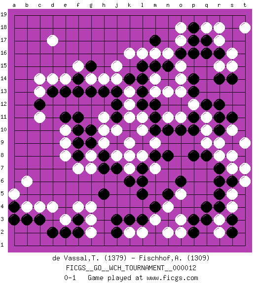 Last move : 0-1 2015 May 11 12:42:32 [Event "FICGS__GO__WCH_TOURNAMENT__000012"] [Site "FICGS"] [Date "2014.11.01"] [Round "1"] [Black "de Vassal,Thibault"] [White "Fischhof,Andrew"] [Result "0-1"] [Rating 1 "1379"] [Rating 2 "1309"] 1.q4 d4 2.q16 d17 3.r10 c11 4.f3 o17 5.r14 k16 6.m17 r17 7.q17 q18 8.p18 r18 9.p17 s15 10.r16 s16 11.s14 t18 12.m15 o3 13.l3 o5 14.p3 r3 15.q3 s5 16.r4 s4 17.s3 r2 18.s2 s8 19.r7 s7 20.r6 r8 21.s6 t6 22.r5 t7 23.q8 q9 24.p8 q10 25.r11 r9 26.o10 q11 27.r12 o11 28.n10 n11 29.m11 n13 30.m12 o14 31.q12 p12 32.p13 o13 33.p10 s10 34.s11 t9 35.p11 m13 36.l13 m14 37.l14 o18 38.o16 n16 39.n15 o15 40.p16 r15 41.p14 m16 42.l15 l16 43.l5 f4 44.d2 e3 45.e2 g3 46.f2 g4 47.c3 c4 48.h7 f7 49.g10 e10 50.f13 j14 51.j13 h14 52.h13 g14 53.g13 e14 54.f14 f15 55.e13 d14 56.d13 c13 57.b3 b4 58.a4 a5 59.a3 b6 60.h5 g2 61.j2 o2 62.p2 l2 63.k3 k2 64.j3 m3 65.m4 n4 66.n5 n2 67.o6 g8 68.h8 k13 69.k14 k12 70.l12 k11 71.m10 h9 72.g9 h10 73.f8 g7 74.f10 e9 75.f9 e8 76.e11 h11 77.f11 j8 78.j7 k8 79.m8 k7 80.k6 m7 81.l7 l8 82.l6 m9 83.n8 l10 84.k10 j10 85.j12 k9 86.g15 j15 87.c12 c14 88.j11 l11 0-1 Comment by player 2 : Andrew Fischhof : Thanks for the game :-) Here are the names of the openings (joseki) played in the four corners : Corner d4 : d4 f3 Hoshi (Hwajeom, Seongjeom, Xingwei`) 4-4 Point. The star or hoshi (4-4) point, emphasizing influence at the potential expense of territory. Ikken Kakari (Hankan Keolch'im, Yi Gua`jiao~, 1-Space Low Approach). Black 2 is the standard approach move to the 4-4. Corner q16 : q16 o17 Hoshi (Hwajeom, Seongjeom, Xingwei`) 4-4 Point. The star or hoshi (4-4) point, emphasizing influence at the potential expense of territory. Ikken Kakari (Hankan Keolch'im, Yi Gua`jiao~, 1-Space Low Approach). White 2 is the standard approach move to the 4-4. Corner q4 : q4 o3 Hoshi (Hwajeom, Seongjeom, Xingwei`) 4-4 Point. The star or hoshi (4-4) point, emphasizing influence at the potential expense of territory. Ikken Kakari (Hankan Keolch'im, Yi Gua`jiao~, 1-Space Low Approach). White 2 is the standard approach move to the 4-4. Player White won this Go (weiqi, baduk) game. Follow this game move after move (download)Grab the border points between two moyos. (Anonymous) The Movers & Shakers of this world are those who play chess in the mornings and go to the disco in the evenings. (Dinesh De Silva)