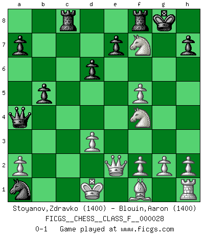 Last move : 0-1 2007 February 27 21:13:9 [Event "FICGS__CHESS__CLASS_F__000028"] [Site "FICGS"] [Date "2007.02.23"] [Round "1"] [White "Stoyanov,Zdravko"] [Black "Blouin,Aaron"] [Result "0-1"] [WhiteElo "1400"] [BlackElo "1400"] 1.e4 Nf6 2.d3 b6 3.Bg5 d6 4.Bxf6 gxf6 5.Qf3 f5 6.exf5 c6 7.Ne2 Bg7 8.c3 Bb7 9.b4 c5 10.Qxb7 Nd7 11.Nf4 Bxc3+ 12.Nxc3 O-O 13.bxc5 Nxc5 14.Qf3 Rc8 15.Ne4 b5 16.Ng5 Qa5+ 17.Kd1 Nb3 18.Qe2 Nxa1 19.Nxf7 Qa4+ 0-1 Alekhine's defense : Maroczy variation Kingside Castling by player Black (move 12) Player Black won this chess game. Follow this game move after move (download)If Chess is a science, it's a most inexact one. If Chess is an art, it is too exacting to be seen as one. If Chess is a sport, it's too esoteric. If Chess is a game, it's too demanding to be just a game. If Chess is a mistress, she's a demanding one. If Chess is a passion, it's a rewarding one. If Chess is life, it's a sad one. (Unknown) Mutter, ich bin eben Ex-Weltmeister geworden. --beim nach Hause Kommen nach dem Verlust des WM-Titels an Mihail Botvinnik -- (Mikhail Nekhemyevich Tal) No puedes jugar al Ajedrez si eres de corazón noble. (Proverbio Francés) Roi des jeux et jeu des rois, les échecs portent en eux un sentiment d'infini. Ils donnent à celui qui s'est efforcé d'en approfondir les arcanes l'impression de n'être pas à la mesure de l'homme; en fait, ils constituent un résumé de l'univers, un microcosme, et figurent cette grande échelle qui, dans les plans de la lumière descend jusqu'à la matière, qui des abîmes insondables remonte jusqu'en l'infini de Dieu. (Pyrame) Convictions are more dangerous enemies of truth than lies. (Friedrich Nietzsche)