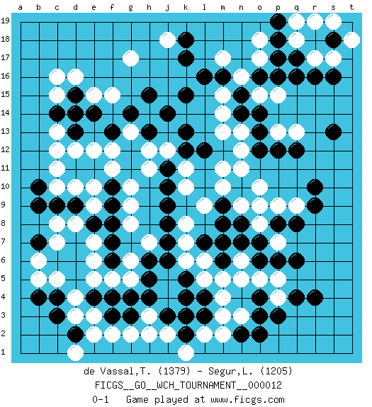 Last move : 0-1 2015 July 20 14:29:40 [Event "FICGS__GO__WCH_TOURNAMENT__000012"] [Site "FICGS"] [Date "2014.11.01"] [Round "1"] [Black "de Vassal,Thibault"] [White "Segur,Laurine"] [Result "0-1"] [Rating 1 "1379"] [Rating 2 "1205"] 1.q4 c16 2.q16 d4 3.r10 d8 4.f3 e3 5.f4 c12 6.k4 g17 7.k17 r17 8.q17 q18 9.r16 s17 10.p18 r19 11.s18 t18 12.s16 s19 13.k15 j18 14.k18 o17 15.p17 o18 16.p19 q19 17.k13 q13 18.p12 p13 19.o12 o15 20.o16 n16 21.p16 m17 22.n15 m15 23.n14 p15 24.s13 n13 25.o14 m14 26.o13 m13 27.l16 m11 28.m16 n11 29.r4 o10 30.q12 p9 31.q8 q9 32.r9 o5 33.o7 p7 34.p8 o8 35.n8 k11 36.m7 h11 37.g14 h14 38.h15 g13 39.h13 h12 40.j14 e15 41.f13 f11 42.e14 d14 43.d13 c13 44.d15 d16 45.c14 c15 46.d14 f15 47.f7 e6 48.f6 e9 49.j10 l9 50.j11 j12 51.k12 k10 52.j9 k8 53.j8 k6 54.l7 k7 55.h6 l5 56.o9 n9 57.m9 m10 58.n10 n12 59.l12 n9 60.m8 o8 61.o6 o9 62.p6 n6 63.n7 n5 64.l4 h7 65.j7 g8 66.j6 m4 67.k5 l6 68.m6 m5 69.o3 p5 70.q6 p4 71.p3 m3 72.l3 l2 73.n2 n3 74.o4 m2 75.o2 j2 76.j3 g2 77.k2 k1 78.k3 h3 79.h4 f2 80.g3 h2 81.c3 g5 82.h5 f5 83.f8 g9 84.g4 e5 85.f9 g10 86.e11 e12 87.d11 d12 88.f10 f12 89.e8 c10 90.d9 d10 91.c9 c8 92.b9 e10 93.b10 c11 94.d7 c7 95.d6 g6 96.e4 d3 97.d5 c5 98.c6 b6 99.c4 b5 100.d2 e2 101.b4 d1 102.b7 e7 0-1 Here are the names of the openings (joseki) played in the four corners : Corner q16 : q16 r17 Hoshi (Hwajeom, Seongjeom, Xingwei`) 4-4 Point. The star or hoshi (4-4) point, emphasizing influence at the potential expense of territory. Player White won this Go (weiqi, baduk) game. Follow this game move after move (download)The nature of a game comes from what is played, but it's the sensitivity to the possible and the impossible that gives it value. (Pierre Audouard) History is a gallery of pictures in which there are few originals and many copies. (Alexis de Tocqueville)