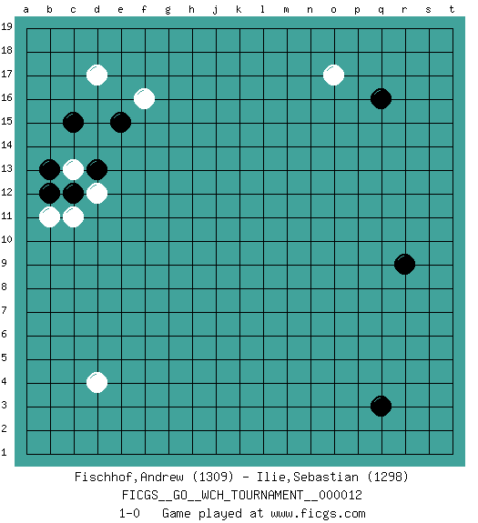 Last move : 1-0 2014 December 13 1:36:15 [Event "FICGS__GO__WCH_TOURNAMENT__000012 "] [Site "FICGS"] [Date "2014.11.01"] [Round "1"] [Black "Fischhof,Andrew "] [White "Ilie,Sebastian "] [Result "1-0"] [Rating 1 "1309"] [Rating 2 "1298"] 1.q16 d17 2.q3 d4 3.r9 o17 4.c15 c13 5.e15 f16 6.d13 d12 7.c12 c11 8.b12 b11 9.b13 1-0 This go game has been lost on time (started : 2014.11.01 20:7:3) Here are the names of the openings (joseki) played in the four corners : Corner q16 : q16 o17Hoshi (Hwajeom, Seongjeom, Xingwei`) 4-4 Point. The star or hoshi (4-4) point, emphasizing influence at the potential expense of territory.Ikken Kakari (Hankan Keolch'im, Yi Gua`jiao~, 1-Space Low Approach). White 2 is the standard approach move to the 4-4. Corner d16 : d17 c15Komoku (Somok, Xiao~mu`) 3-4 Point. The komoku (3-4) point is the traditional corner enclosure move..Ikken Kakari (Hankan Keolch'im, Yi Gua`jiao~, 1-Space Low Pincer). The small knight move is the basic approach move to the 3-4 point stone. It has been continually used for over four centuries. There are limitless variations, with new moves constantly being discovered. Black 2 opens the door to a treaure store of joseki. Player Black won this Go (weiqi, baduk) game.Follow this game move after move (download ) Six eyes in a rectangle are alive. (Anonymous) I feel so... helpless. (C-3PO in Star Wars ep.3)