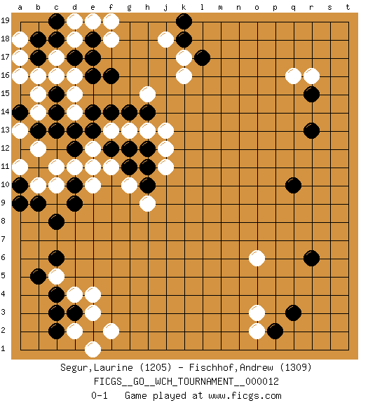 Last move : 0-1 2015 March 31 16:0:36 [Event "FICGS__GO__WCH_TOURNAMENT__000012"] [Site "FICGS"] [Date "2014.11.01"] [Round "1"] [Black "Segur,Laurine"] [White "Fischhof,Andrew"] [Result "0-1"] [Rating 1 "1205"] [Rating 2 "1309"] 1.c4 d16 2.q3 q16 3.r6 e3 4.d3 e4 5.q10 c5 6.e2 f2 7.b5 d4 8.c3 d2 9.c2 e1 10.c6 c10 11.b9 b10 12.c8 o3 13.p2 o2 14.r13 k16 15.r15 r16 16.c15 c16 17.c13 b14 18.b13 d14 19.c14 b15 20.a14 a16 21.d12 e10 22.d10 d11 23.d9 c11 24.f12 e12 25.e13 e11 26.d13 f13 27.e14 d15 28.f14 g13 29.g11 f11 30.f16 h15 31.e17 d18 32.b18 f18 33.d17 c17 34.b17 b16 35.e18 e19 36.c18 d19 37.e16 a18 38.c19 f19 39.a10 a17 40.g12 g10 41.g14 h13 42.h12 j12 43.h14 j13 44.h11 j11 45.h10 h9 46.b11 o6 47.l17 k17 48.k18 j18 49.k19 b12 50.a12 a11 51.a9 a13 0-1 Here are the names of the openings (joseki) played in the four corners : Corner d4 : c4 e3 Komoku (Somok, Xiao~mu`) 3-4 Point. The komoku (3-4) point is the traditional corner enclosure move.. Ikken Kakari (Hankan Keolch'im, Yi Gua`jiao~, 1-Space Low Pincer). The small knight move is the basic approach move to the 3-4 point stone. It has been continually used for over four centuries. There are limitless variations, with new moves constantly being discovered. White 2 opens the door to a treaure store of joseki. Corner q16 : q16 r13 Hoshi (Hwajeom, Seongjeom, Xingwei`) 4-4 Point. The star or hoshi (4-4) point, emphasizing influence at the potential expense of territory. Niken Kakari (Dukan Keolch'im, E`r Gua`jiao~, 2-Space Low Approach). White typically answers by 7-3 or 3-5 (which is not joseki). Corner d16 : d16 c15 Hoshi (Hwajeom, Seongjeom, Xingwei`) 4-4 Point. The star or hoshi (4-4) point, emphasizing influence at the potential expense of territory. Player White won this Go (weiqi, baduk) game. Follow this game move after move (download)Avoid the plate connection. (Anonymous) All battles are fought by scared men who'd rather be someplace else. (John Wayne in the movie In harm's way)