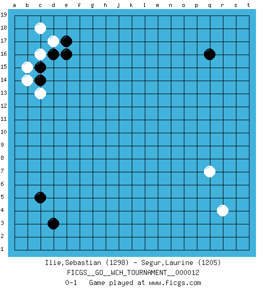 Last move : 0-1 2014 December 12 13:30:11 [Event "FICGS__GO__WCH_TOURNAMENT__000012"] [Site "FICGS"] [Date "2014.11.01"] [Round "1"] [Black "Ilie,Sebastian"] [White "Segur,Laurine"] [Result "0-1"] [Rating 1 "1298"] [Rating 2 "1205"] 1.q16 r4 2.d3 c16 3.c5 q7 4.e16 d17 5.e17 c13 6.c15 b15 7.c14 b14 8.d16 c18 0-1 This go game has been lost on time (started : 2014.11.01 20:7:3) Here are the names of the openings (joseki) played in the four corners : Corner d16 : c16 e16 Komoku (Somok, Xiao~mu`) 3-4 Point. The komoku (3-4) point is the traditional corner enclosure move.. Ikken Takagakari (Hankan Nop'dakeolch'im, Yi Gaogua`jiao~, 1-Space High Approach). The 5-4 approach move has become more popular in modern times, as modern Go emphasizes speed and influence. Player White won this Go (weiqi, baduk) game. Follow this game move after move (download)Everything would seem to be possible in Go. Like pulling a rabbit, by a magical move, out of a hat. (Pierre Audouard) The beginning of wisdom is silence. The second step is listening. (Unknown)