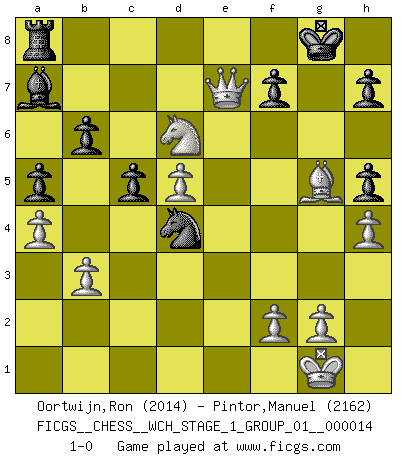 Last move : 1-0 2014 November 26 16:21:0 [Event "FICGS__CHESS__WCH_STAGE_1_GROUP_01__000014"] [Site "FICGS"] [Date "2014.11.01"] [Round "1"] [White "Oortwijn,Ron"] [Black "Pintor,Manuel"] [Result "1-0"] [WhiteElo "2014"] [BlackElo "2162"] 1.e4 e5 2.Nf3 Nc6 3.d4 exd4 4.Nxd4 Qf6 5.Be3 Bc5 6.c3 d6 7.Be2 Nh6 8.O-O Nxd4 9.cxd4 Bb6 10.a4 a5 11.Na3 O-O 12.Nc4 Ba7 13.Rc1 c5 14.d5 Qg6 15.Bh5 Qf6 16.Re1 b6 17.b3 Re8 18.h4 Rxe4 19.Bg5 Bg4 20.Bxg4 Rxe1+ 21.Qxe1 Qd4 22.Bh5 Nf5 23.Rd1 g6 24.Rxd4 Nxd4 25.Nxd6 gxh5 26.Qe7 1-0 Scotch game Kingside Castling by player White (move 8) Kingside Castling by player Black (move 11) Player White won this chess game. Follow this game move after move (download)For surely of all the drugs in the world, Chess must be the most permanently pleasurable. (Assiac) Schon mancher Spieler hat aufgegeben, um zu vermeiden, daß er eine Figur verliert. (Savielly Grigorievitsch Tartakower) Tu puedes aprender mucho mas de una partida que pierdas que de una partida ganada. Tendras que perder cientos de partidas antes de llegar a ser un buen jugador. (Jose Raul Capablanca) Mais n'est-ce pas déjà le limiter injurieusement que d'appeler les échecs un jeu? N'est-ce pas aussi une science, un art, ou quelque chose qui, comme le cercueil de Mahomet entre ciel et terre, est suspendu entre l'un et l'autre, et qui réunit un nombre incroyable de contraires ? (Stefan Zweig) Computers have lots of memory but no imagination. (Anonymous)