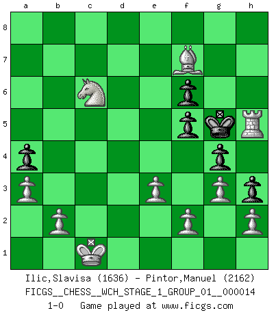 Last move : 1-0 2014 December 8 4:55:28 [Event "FICGS__CHESS__WCH_STAGE_1_GROUP_01__000014"] [Site "FICGS"] [Date "2014.11.01"] [Round "1"] [White "Ilic,Slavisa"] [Black "Pintor,Manuel"] [Result "1-0"] [WhiteElo "1636"] [BlackElo "2162"] 1.d4 d5 2.Bg5 Nc6 3.e3 h6 4.Bh4 Nf6 5.Bxf6 exf6 6.c4 Bf5 7.a3 a5 8.cxd5 Qxd5 9.Nc3 Qd7 10.Bb5 Rd8 11.d5 Qe7 12.Qa4 Qd6 13.O-O-O Qc5 14.Nge2 Be4 15.Qxe4+ Be7 16.dxc6 O-O 17.Rxd8 Rxd8 18.cxb7 f5 19.Qc4 Rb8 20.Qxc5 Bxc5 21.Bc6 g5 22.Rd1 Bd6 23.Nb5 Kg7 24.Nxd6 cxd6 25.Rxd6 f6 26.Nd4 Kg6 27.Rd7 g4 28.Bd5 h5 29.g3 Kg5 30.Nc6 Rxb7 31.Rxb7 h4 32.Rh7 h3 33.Bf7 a4 34.Rh5+ 1-0 Levitsky attack (Queen's Bishop attack) Queenside Castling by player White (move 13) Kingside Castling by player Black (move 16) Player White won this chess game. Follow this game move after move (download)A Chess game is divided into three stages: the first, when you hope you have the advantage, the second when you believe you have an advantage, and the third... when you know you're going to lose ! (Savielly Tartakower) Im Schach gewinnt jeder. Hat man Freunde am Spiel - und das ist die Hauptsache - ist auch der Verlust einer Partie kein Unglück. (David Bronstein) En manos de Fischer's, una diminuta ventaja teórica es tan buena como tener una Reina de ventaja. (Isaac Kashdan) La guerre est enfant de la passion, la passion est enfant du narcissisme et le narcissisme est l'enfant. (...) Une autre partie ? (Thibault de Vassal) You can't play chess if you're groggy from pills. (Anatoly Karpov)
