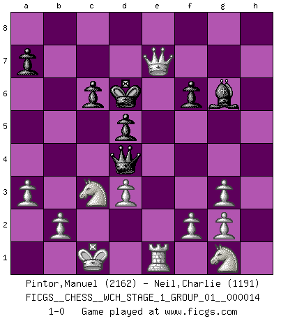 Last move : 1-0 2014 December 3 21:15:10 [Event "FICGS__CHESS__WCH_STAGE_1_GROUP_01__000014"] [Site "FICGS"] [Date "2014.11.01"] [Round "1"] [White "Pintor,Manuel"] [Black "Neil,Charlie"] [Result "1-0"] [WhiteElo "2162"] [BlackElo "1191"] 1.e4 e6 2.Nc3 d5 3.exd5 exd5 4.d4 Bb4 5.Bd2 Ne7 6.Qf3 Be6 7.O-O-O Nd7 8.a3 Bd6 9.Bg5 f6 10.Bh4 c6 11.Re1 Bf7 12.Bg3 Bxg3 13.hxg3 Qb6 14.Qg4 Nf8 15.Qxg7 Nfg6 16.Rxh7 Rxh7 17.Qxh7 Qxd4 18.Bd3 Ne5 19.Qh8+ Kd7 20.Qxa8 Nxd3+ 21.cxd3 Bg6 22.Qxb7+ Kd6 23.Qxe7+ 1-0 French defense Queenside Castling by player White (move 7) Player White won this chess game. Follow this game move after move (download)Chess is a forcing house where the fruits of character can ripen more fully than in life. (Edward Morgan Foster) Du weisst es gibt ein Problem mit Computern und Fernschach, wenn jeder eine Rating von 2450 hat. (John Christen Knudsen) Debemos de asegurarnos de que el Ajedrez no se convierta en un lenguaje muerto, muy interesante, pero tan solo para un grupo muy pequeño. (Sytze Faber) Assurément je connaissais par expérience le mystérieux attrait de ce jeu royal, le seul entre tous les jeux inventés par les hommes qui échappe souverainement à la tyrannie du hasard, le seul où l'on ne doive sa victoire qu'à son intelligence ou plutôt à une certaine forme d'intelligence. Mais n'est-ce pas déjà le limiter injurieusement que d'appeler les échecs un jeu ? N'est-ce pas une science, un art ou quelque chose qui, comme le cercueil de Mahomet entre ciel et terre, est suspendu entre l'un et l'autre, et qui réunit un nombre incroyable de contraires ? [...] C'est une pensée qui ne mène à rien, une mathématique qui n'établit rien, un art qui ne laisse pas d'uvre, une architecture sans matière; et il l'a prouvé néanmoins qu'il était plus durable, à sa manière, que les livres ou que tout autre monument, ce jeu unique qui appartient à tous les peuples et à tous les temps, et dont personne ne sait quel dieu en fit don à la terre pour tuer l'ennui, pour aiguiser l'esprit et stimuler l'âme. Où commence-t-il, où finit-il ? (Stefan Zweig) The Internet is so big, so powerful and pointless that for some people it is a complete substitute for life. (Andrew Brown)