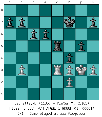 Last move : 0-1 2014 November 22 13:48:43 [Event "FICGS__CHESS__WCH_STAGE_1_GROUP_01__000014"] [Site "FICGS"] [Date "2014.11.01"] [Round "1"] [White "Leurette,Marc-Antoine"] [Black "Pintor,Manuel"] [Result "0-1"] [WhiteElo "1185"] [BlackElo "2162"] 1.e4 e5 2.Nf3 Nc6 3.Bc4 Bc5 4.d4 exd4 5.c3 Qf6 6.O-O d6 7.cxd4 Nxd4 8.Nxd4 Bxd4 9.Nd2 Bxb2 10.Bxb2 Qxb2 11.Qc1 Qxc1 12.Raxc1 Nf6 13.Rfe1 O-O 14.Nf3 Bg4 15.Bb3 c6 16.Re3 Rae8 17.e5 Bxf3 18.gxf3 Rxe5 19.Kh1 Rfe8 20.Rce1 Nd7 21.Rxe5 Rxe5 22.Re4 Nc5 23.Re3 Nxb3 24.axb3 g5 25.h3 f5 26.Kg2 Kf7 27.Kg3 f4+ 0-1 Giuoco Piano Kingside Castling by player White (move 6) Kingside Castling by player Black (move 13) Player Black won this chess game. Follow this game move after move (download)Modern Chess is too much concerned with things like Pawn structure. Forget it, Checkmate ends the game. (Nigel Short) Schachspieler können ausgezeichnet Varianten am Schachbrett berechnen, aber nicht im realen Leben. Zu stark ist der Individualismus im Schach ausgeprägt, und für viele ist ein kleiner momentaner persönlicher Vorteil wichtiger als ein weit größerer Vorteil von morgen. (Anatoly Karpov) Si yo gano un torneo, yo lo gano por mí mismo. Yo hago las jugadas. Nadie me ayuda. (Bobby Fischer) Le profane ne songe pas à la somme de jouissance dont il se prive, qui méconnaît ce jeu aux ressources aussi variées que passionnantes. (Jean-Marie Jeanton-Lamarche) Never was anything great achieved without danger. (Niccolo Machiavelli)