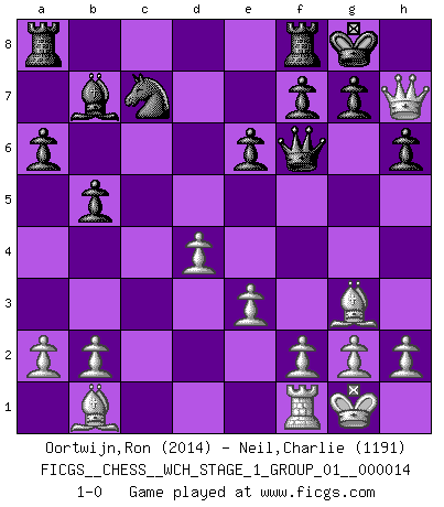 Last move : 1-0 2014 December 5 9:50:42 [Event "FICGS__CHESS__WCH_STAGE_1_GROUP_01__000014"] [Site "FICGS"] [Date "2014.11.01"] [Round "1"] [White "Oortwijn,Ron"] [Black "Neil,Charlie"] [Result "1-0"] [WhiteElo "2014"] [BlackElo "1191"] 1.Nf3 Nf6 2.d4 d5 3.Bg5 e6 4.e3 c6 5.Nbd2 Nbd7 6.c4 a6 7.Bd3 Be7 8.O-O O-O 9.Rc1 dxc4 10.Nxc4 h6 11.Bh4 Qc7 12.Bg3 Qd8 13.Bb1 b5 14.Nce5 Nb6 15.Nxc6 Qd7 16.Nfe5 Qe8 17.Qd3 Bb7 18.Nxe7+ Qxe7 19.Ng4 Nbd5 20.Rc7 Nxc7 21.Nxf6+ Qxf6 22.Qh7+ 1-0 Reti Opening Kingside Castling by player White (move 8) Kingside Castling by player Black (move 8) Player White won this chess game. Follow this game move after move (download)When I asked Fischer why he had not played a certain move in our game, he replied: 'Well, you laughed when I wrote it down !' (Mikhail Tal) Lisa Lane, amerikanische Schachmeisterin, hatte Fischer einmal als stärksten lebenden Spieler bezeichnet. Antwort: Das ist richtig, aber Lisa Lane ist eigentlich nicht in der Lage, das zu beurteilen. (Robert James Fischer) El Ajedrez es un terrible juego. Si no controlas el centro, tu oponente tiene una posición mas holgada. Si tienes control del centro, ¡entonces realmente tu tienes algo de que preocuparte!. (Siegbert Tarrasch) Aucun coup ne doit être joué sans but. (Pedro Damiano) However beautiful the strategy, you should occasionally look at the results. (Winston Churchill)