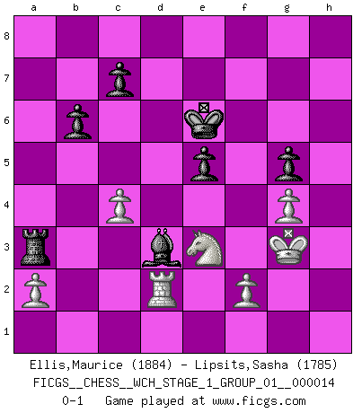 Last move : 0-1 2015 February 2 16:58:53 [Event "FICGS__CHESS__WCH_STAGE_1_GROUP_01__000014"] [Site "FICGS"] [Date "2014.11.30"] [Round "1"] [White "Ellis,Maurice"] [Black "Lipsits,Sasha"] [Result "0-1"] [WhiteElo "1884"] [BlackElo "1785"] 1.e4 e5 2.Nf3 Nc6 3.Bb5 a6 4.Ba4 Nf6 5.O-O Bc5 6.c3 Ba7 7.d4 O-O 8.Bg5 h6 9.Bxf6 Qxf6 10.Bxc6 Qxc6 11.Nbd2 d6 12.dxe5 dxe5 13.Nxe5 Qb5 14.Nec4 Rd8 15.Qc2 Bg4 16.Rfe1 Rd7 17.Ne3 Rad8 18.Ndf1 Bxe3 19.Nxe3 Rd2 20.Qc1 Bh5 21.b3 Qc5 22.b4 Qg5 23.Nf1 Bf3 24.g3 R2d3 25.Qxg5 hxg5 26.Rac1 g4 27.e5 Re8 28.Rc2 f6 29.c4 Rxe5 30.Rxe5 fxe5 31.Ne3 Kf7 32.Kf1 Ke6 33.Ke1 Rd8 34.Kf1 Rh8 35.Kg1 Rd8 36.Kf1 Rh8 37.Kg1 a5 38.bxa5 Ra8 39.h3 gxh3 40.Kh2 g5 41.g4 Be4 42.Rb2 Rxa5 43.Kxh3 b6 44.Rd2 Ra3 45.Kg3 Bd3 0-1 Ruy Lopez : Moeller defense Kingside Castling by player White (move 5) Kingside Castling by player Black (move 7) Player Black won this chess game. Follow this game move after move (download)Chess is a fairy tale of 1001 blunders. (Savielly Tartakower) Wenn Du einsam bist, wenn Du Dich in der Welt wie ein Fremder fühlst, spiele Schach. Das wird Deinen Geist erheben und Dein Ratgeber im Kampf sein. (Aristoteles) La pasion por jugar al Ajedrez es una de las mas inexplicables en el mundo. (H.G. Wells) Mais n'est-ce pas déjà le limiter injurieusement que d'appeler les échecs un jeu? N'est-ce pas aussi une science, un art, ou quelque chose qui, comme le cercueil de Mahomet entre ciel et terre, est suspendu entre l'un et l'autre, et qui réunit un nombre incroyable de contraires ? (Stefan Zweig) I don't diet. I just don't eat as much as I'd like to. (Linda Evangelista, supermodel)