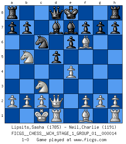 Last move : 1-0 2014 December 18 23:41:18 [Event "FICGS__CHESS__WCH_STAGE_1_GROUP_01__000014"] [Site "FICGS"] [Date "2014.11.30"] [Round "1"] [White "Lipsits,Sasha"] [Black "Neil,Charlie"] [Result "1-0"] [WhiteElo "1785"] [BlackElo "1191"] 1.e4 c5 2.Nf3 d6 3.d4 cxd4 4.Nxd4 Nf6 5.Nc3 Nc6 6.Bg5 e6 7.Qd2 Be7 8.O-O-O Bd7 9.Ndb5 d5 10.Bxf6 1-0 Sicilian : Richter-Rauzer, Rauzer attack, 7...Be7 Queenside Castling by player White (move 8) Player White won this chess game. Follow this game move after move (download)The tactician knows what to do when there is something to do; whereas the strategian knows what to do when there is nothing to do. (Gerald Abrahams) Es gibt keine einzige Frau, der ich nicht einen Springer vorgeben könnte und trotzdem gewänne. (Robert James Fischer) El juego de Damas es para vagabundos. (Paul Morphy) Même un GMI sait rarement calculer sur plus de cinq coups une attaque à sacrifices. (Rudolf Spielmann) Luck never made a man wise. (Seneca, Letters to Lucilius)