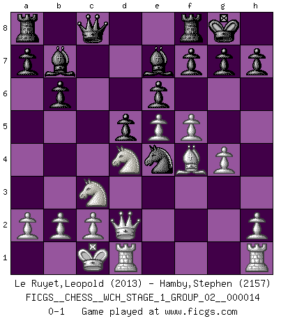 Last move : 0-1 2015 February 8 7:33:39 [Event "FICGS__CHESS__WCH_STAGE_1_GROUP_02__000014"] [Site "FICGS"] [Date "2014.11.01"] [Round "1"] [White "Le Ruyet,Leopold"] [Black "Hamby,Stephen"] [Result "0-1"] [WhiteElo "2013"] [BlackElo "2157"] 1.e4 e6 2.d4 d5 3.Nc3 Nf6 4.e5 Nfd7 5.f4 c5 6.Nf3 Be7 7.Be3 Nc6 8.Qd2 O-O 9.dxc5 Nxc5 10.O-O-O b6 11.Bb5 Bb7 12.Bxc6 Bxc6 13.Nd4 Bb7 14.f5 Qc7 15.Bf4 Qc8 16.g4 Ne4 0-1 This chess game has been lost on time (started : 2014.11.01 20:39:54) French : Steinitz variation Kingside Castling by player Black (move 8) Queenside Castling by player White (move 10) Player Black won this chess game. Follow this game move after move (download)Chess is life. (Bobby Fischer) Schachspieler können ausgezeichnet Varianten am Schachbrett berechnen, aber nicht im realen Leben. Zu stark ist der Individualismus im Schach ausgeprägt, und für viele ist ein kleiner momentaner persönlicher Vorteil wichtiger als ein weit größerer Vorteil von morgen. (Anatoly Karpov) Los Peones son nacidos libres, y aún así, se encuentran encadenados por todos lados. (Rick Kennedy) Fischer est le meilleur joueur du monde et Karpov n'est qu'un joueur de bistrot. (Garry Kasparov, agé de 16 ans) There will be no order, only chaos. (Sol Robeson in Pi by Darren Aronofsky)