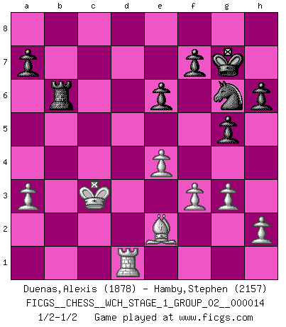 Last move : 1/2-1/2 2015 January 15 11:45:22 [Event "FICGS__CHESS__WCH_STAGE_1_GROUP_02__000014"] [Site "FICGS"] [Date "2014.11.01"] [Round "1"] [White "Duenas,Alexis"] [Black "Hamby,Stephen"] [Result "1/2-1/2"] [WhiteElo "1878"] [BlackElo "2157"] 1.d4 Nf6 2.c4 e6 3.Nc3 Bb4 4.Qc2 O-O 5.a3 Bxc3+ 6.Qxc3 b6 7.Bg5 Bb7 8.f3 h6 9.Bh4 d5 10.e3 Nbd7 11.cxd5 Nxd5 12.Bxd8 Nxc3 13.Bh4 Nd5 14.Bf2 Rfd8 15.e4 Ne7 16.Rc1 Rac8 17.Ne2 c5 18.dxc5 Nxc5 19.Bxc5 Rxc5 20.Rxc5 bxc5 21.Nc1 Rd6 22.Nd3 Rb6 23.Kd2 c4 24.Nc5 Rxb2+ 25.Kc3 Rb5 26.Nxb7 Rxb7 27.Bxc4 g5 28.Ba6 Rb6 29.Be2 Ng6 30.g3 Kg7 31.Rd1 1/2-1/2 Nimzo-Indian : Classical variation Kingside Castling by player Black (move 4) This chess game ended in a draw. Follow this game move after move (download)Chess teaches you to control the initial excitement you feel when you see something that looks good and it trains you to think objectively when you're in trouble. (Stanley Kubrick) Capablanka war das größte Genie der Schachgeschichte! Aber denken sie nicht er habe nichts vom Schach verstanden. Er wusste nur soviel wie er wissen musste um seine Ziele zu erreichen. (Mikhail Moiseyevich Botvinik) No puedes jugar al Ajedrez si eres de corazón noble. (Proverbio Francés) Aidez vos pièces, elles vous aideront. (Paul Morphy) We cannot be sure of having something to live for unless we are willing to die for it. (Ernesto Che Guevara)
