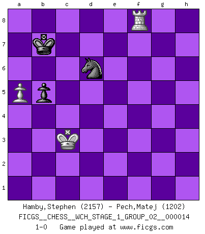 Last move : 1-0 2015 July 10 15:3:1 [Event "FICGS__CHESS__WCH_STAGE_1_GROUP_02__000014"] [Site "FICGS"] [Date "2014.11.01"] [Round "1"] [White "Hamby,Stephen"] [Black "Pech,Matej"] [Result "1-0"] [WhiteElo "2157"] [BlackElo "1202"] 1.d4 Nf6 2.c4 e6 3.Nc3 Bb4 4.f3 d5 5.a3 Bxc3+ 6.bxc3 c5 7.cxd5 exd5 8.e3 O-O 9.Bd3 b6 10.Ne2 Re8 11.O-O Ba6 12.Ng3 Bxd3 13.Qxd3 Nc6 14.Bb2 Rc8 15.Rad1 Na5 16.e4 Nc4 17.Bc1 cxd4 18.cxd4 Kh8 19.e5 Ng8 20.f4 b5 21.f5 Qb6 22.f6 gxf6 23.exf6 Rc6 24.Nh5 Nxf6 25.Qf3 Ne4 26.Qxf7 Rg8 27.Rd3 Rd6 28.Nf4 Nf6 29.Re1 Rd7 30.Qe6 Qxe6 31.Rxe6 Rf7 32.g3 Rb8 33.Rf3 Kg8 34.Nd3 Ne4 35.Rxf7 Kxf7 36.Ra6 Rb7 37.Bf4 Ke8 38.Kg2 Re7 39.h4 Rf7 40.h5 Re7 41.Ne5 Nxe5 42.dxe5 Rc7 43.e6 Rc2+ 44.Kf3 Rc3+ 45.Kg4 d4 46.Rxa7 d3 47.h6 Rc5 48.Rg7 Rd5 49.Kf3 d2 50.Bxd2 Nxd2+ 51.Kf4 Rd6 52.Ke5 Rd3 53.Rxh7 Rxg3 54.Ra7 Nc4+ 55.Kf4 Rh3 56.h7 Rh5 57.Kg4 Rh2 58.Kf5 Nd6+ 59.Ke5 Nc4+ 60.Kd4 Rh4+ 61.Kc5 Rh5+ 62.Kb4 Nb6 63.Kc3 Rh4 64.Kd3 Kf8 65.Rf7+ Ke8 66.Rb7 Nc4 67.Rb8+ Ke7 68.h8Q Rxh8 69.Rxh8 Kxe6 70.Ra8 Kd5 71.Kc3 Kc5 72.Rc8+ Kb6 73.Rb8+ Ka5 74.Ra8+ Kb6 75.a4 Nd6 76.a5+ Kb7 77.Rf8 1-0 Nimzo-Indian : Kmoch variation Kingside Castling by player Black (move 8) Kingside Castling by player White (move 11) 10 pieces endgame at move 53 : White KRPPPP , Black KRNP WHITE : King + 1 Rook 4 Pawns BLACK : King + 1 Rook 1 Knight 1 Pawn 9 pieces endgame at move 53 : White KRPPP , Black KRNP WHITE : King + 1 Rook 3 Pawns BLACK : King + 1 Rook 1 Knight 1 Pawn Promotion Queen by player White (move 68) 8 pieces endgame at move 68 : White KRPP , Black KRNP WHITE : King + 1 Rook 2 Pawns BLACK : King + 1 Rook 1 Knight 1 Pawn 7 pieces endgame at move 69 : White KRPP , Black KNP WHITE : King + 1 Rook 2 Pawns BLACK : King + 1 Knight 1 Pawn 6 pieces endgame at move 69 : White KRP , Black KNP WHITE : King + 1 Rook 1 Pawn BLACK : King + 1 Knight 1 Pawn Player White won this chess game. Follow this game move after move (download)It's just you and your opponent at the board and you're trying to prove something. (Bobby Fischer) Korrekt heißt in Deutschland die Haltung eines Mannes, dessen Benehmen nach dem Urteile seiner Nachbarn seiner Stellung angemessen ist. Um korrekt zu sein, muß man sich der Meinung der anderen anpassen... (Emanuel Lasker) El juego de Fischer siempre fue nítido, racional y brillante. Uno de los mejores por siempre. (Dave Regis) Il s'avisa de me proposer d'apprendre les échecs qu'il jouait un peu... me voilà forcené des échecs. J'achète un échiquier, je m'enferme dans ma chambre, j'y passe des jours et des nuits à vouloir apprendre par cur toutes les parties. (Jean-Jacques Rousseau, Confessions) SEO proverb : Make your website optimized for human beings, not for search engines.