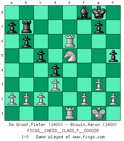 Last move : 1-0 2007 March 2 19:15:14 [Event "FICGS__CHESS__CLASS_F__000028"] [Site "FICGS"] [Date "2007.02.23"] [Round "1"] [White "De Groof,Pieter"] [Black "Blouin,Aaron"] [Result "1-0"] [WhiteElo "1400"] [BlackElo "1400"] 1.e4 e6 2.d3 Nf6 3.g3 d5 4.Nd2 Bd6 5.Ngf3 Nbd7 6.Bg2 b6 7.Qe2 Bb7 8.e5 Nxe5 9.Nxe5 O-O 10.O-O c5 11.Ndf3 d4 12.Bg5 h6 13.Bxf6 Qxf6 14.Nd7 Qd8 15.Nxf8 Bxf8 16.Ne5 Rb8 17.Nxf7 Qe7 18.Bxb7 Rxb7 19.Ne5 Qf6 20.Rae1 Bd6 21.Ng4 Qf5 22.Qxe6+ Qxe6 23.Rxe6 Bf8 24.Rfe1 h5 25.Ne5 1-0 French : King's Indian attack Kingside Castling by player Black (move 9) Kingside Castling by player White (move 10) Player White won this chess game. Follow this game move after move (download)Best by test: 1. e4 (Bobby Fischer) Fischer machte Schach einfach zu einer aufregenden Sache, wann immer er sich ans Brett setzte. (Raymond Keene) Uno no tiene que jugar muy bien, es suficiente jugar mejor que el oponente. (Siegbert Tarrasch) Les Echecs sont affaire de jugement sensible. Savoir quand frapper et quand esquiver. (Fischer) Drag your thoughts away from your troubles... by the ears, by the heels, or any other way you can manage it. (Mark Twain)