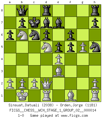 Last move : 1-0 2014 November 17 23:25:3 [Event "FICGS__CHESS__WCH_STAGE_1_GROUP_02__000014"] [Site "FICGS"] [Date "2014.11.01"] [Round "1"] [White "Sinsuat,Datuali"] [Black "Orden,Jorge"] [Result "1-0"] [WhiteElo "2038"] [BlackElo "1181"] 1.e4 c5 2.Nf3 d6 3.d4 cxd4 4.Nxd4 Nf6 5.Nc3 a6 6.Be3 e6 7.f3 Be7 8.Qd2 Nc6 9.O-O-O Qc7 10.g4 Bd7 11.g5 Nh5 12.f4 g6 13.Kb1 f6 14.f5 e5 15.Nde2 O-O-O 16.Nd5 Qb8 17.Nb6+ Kc7 18.Nc3 gxf5 19.Ncd5+ 1-0 Sicilian : Najdorf, Byrne (English) attack Queenside Castling by player White (move 9) Queenside Castling by player Black (move 15) Player White won this chess game. Follow this game move after move (download)The older I grow, the more I value pawns. (Paul Keres) Die starken Figuren des Gegners muss man abtauschen. (José Raúl Capablanca) Robert Fischer es la ley hacia si mismo. (Larry Evans) Botvinnik disait en comparant les échecs à la musique: Il existe une science dont le but est l'étude de l'acoustique et des sons. Mais il y a aussi un art qui se sert de l'océan des sons : c'est la musique. De toute évidence, il en est de même pour la pensée. La logique est l'étude des lois de la réflexion et les échecs reflètent, en tant qu'art, le côté logique de la réflexion, sous la forme d'images artistiques... Extrait de Fischer - Spassky, Reykjavik 1972 par Alexander & F. Wyndham (Ed. Solar), p 37. All maxims have their antagonist maxims; proverbs should be sold in pairs, a single one being but a half truth. (William Mathews)
