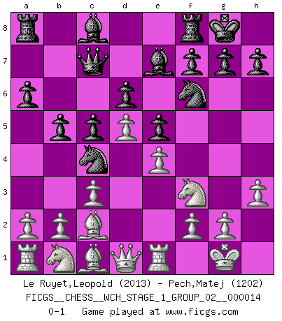 Last move : 0-1 2015 February 18 7:50:9 [Event "FICGS__CHESS__WCH_STAGE_1_GROUP_02__000014"] [Site "FICGS"] [Date "2014.11.01"] [Round "1"] [White "Le Ruyet,Leopold"] [Black "Pech,Matej"] [Result "0-1"] [WhiteElo "2013"] [BlackElo "1202"] 1.e4 e5 2.Nf3 Nc6 3.Bb5 a6 4.Ba4 Nf6 5.O-O Be7 6.Re1 b5 7.Bb3 d6 8.c3 O-O 9.h3 Na5 10.Bc2 c5 11.d4 Qc7 12.d5 Nc4 0-1 This chess game has been lost on time (started : 2014.11.01 20:39:54) Ruy Lopez : Closed Kingside Castling by player White (move 5) Kingside Castling by player Black (move 8) Player Black won this chess game. Follow this game move after move (download)It is always better to sacrifice your opponent's men. (Savielly Tartakower) Aljechin war kein Nazi. Er war ein Opportunist. Ein schrecklicher Mann. Er liebte Geld über alles und würde für Geld ein Jude, ein Katolik oder ein Protestant werden. (Miguel Najdorf) La maestría del Ajedrez consiste esencialmente en analizar posiciónes de Ajedrez con precisión. (Mikhail Botvinnik) Le succès, c'est être capable d'aller d'échec en échec sans perdre son enthousiasme. (Winston Churchill) Wisdom begins at the end. (Daniel Webster)