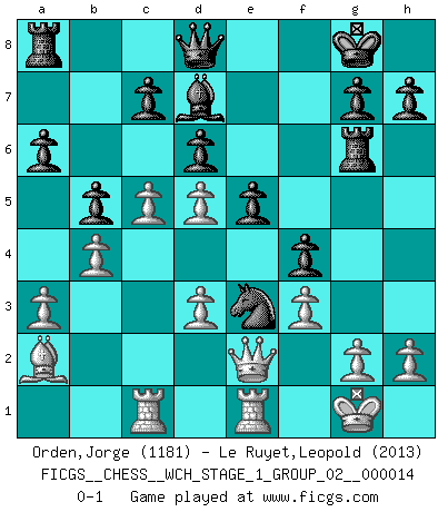 Last move : 0-1 2014 December 18 22:46:24 [Event "FICGS__CHESS__WCH_STAGE_1_GROUP_02__000014"] [Site "FICGS"] [Date "2014.11.01"] [Round "1"] [White "Orden,Jorge"] [Black "Le Ruyet,Leopold"] [Result "0-1"] [WhiteElo "1181"] [BlackElo "2013"] 1.e4 e5 2.Nf3 Nc6 3.Bb5 a6 4.Ba4 Nf6 5.Nc3 b5 6.Bb3 Be7 7.O-O d6 8.Ng5 O-O 9.a3 Bg4 10.f3 Bd7 11.Nd5 Nxd5 12.exd5 Nd4 13.d3 Bxg5 14.c4 Bxc1 15.Rxc1 f5 16.Ba2 f4 17.b4 Nf5 18.Qe2 Ne3 19.Rfe1 Rf6 20.c5 Rg6 0-1 Ruy Lopez : Four knights (Tarrasch) variation Kingside Castling by player White (move 7) Kingside Castling by player Black (move 8) Player Black won this chess game. Follow this game move after move (download)Chess is like war on a board. (Bobby Fischer) Es gibt nur zwei wahre Schachgenies - das andere war Wilhelm Steinitz, der Weltmeister von 1872 bis 1894. (Robert James Fischer) El Ajedrez es el gimnasio de la mente. (Blaise Pascal) Horreur, mais aussi harmonie suprême : qu'y avait-il en effet au monde en dehors des échecs ? Le brouillard, l'inconnu, le non-être... (Vladimir Nabokov) It's unlucky to be superstitious. (Dave Enteles)