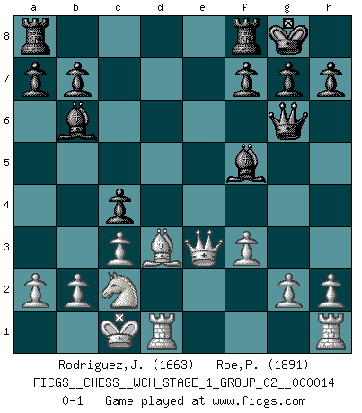 Last move : 0-1 2014 December 13 19:17:33 [Event "FICGS__CHESS__WCH_STAGE_1_GROUP_02__000014"] [Site "FICGS"] [Date "2014.11.01"] [Round "1"] [White "Rodriguez,Juan Antonio"] [Black "Roe,Philip"] [Result "0-1"] [WhiteElo "1663"] [BlackElo "1891"] 1.e4 e5 2.Nf3 Nc6 3.d4 exd4 4.Nxd4 Bc5 5.Be3 Qf6 6.c3 Qg6 7.f3 Nge7 8.Nd2 O-O 9.N2b3 Bb6 10.Qd2 d5 11.exd5 Nxd5 12.O-O-O Nxe3 13.Qxe3 Nxd4 14.Nxd4 c5 15.Nc2 Bf5 16.Bd3 c4 0-1 Scotch game Kingside Castling by player Black (move 8) Queenside Castling by player White (move 12) Player Black won this chess game. Follow this game move after move (download)The combination player thinks forward; he starts from the given position, and tries the forceful moves in his mind. (Emanuel Lasker) Der Bart als Geschlechtszeichen mitten im Gesicht ist obszön. Daher gefällt er den Weibern. [Zugegeben, kein Schachzitat, aber unglaublich originell] (Arthur Schopenhauer) El Ajedrez es la vida. (Bobby Fischer) Tous ces prétendus hommes politiques sont les pions, les Cavaliers, les Tours ou les Fous d'une partie d'échecs qui se jouera tant qu'un hasard ne renversera pas l'échiquier. (Honoré de Balzac) I just play for fun. (Anna Kournikova)