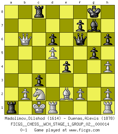 Last move : 0-1 2014 December 27 15:22:21 [Event "FICGS__CHESS__WCH_STAGE_1_GROUP_02__000014"] [Site "FICGS"] [Date "2014.11.01"] [Round "1"] [White "Madolimov,Dilshod"] [Black "Duenas,Alexis"] [Result "0-1"] [WhiteElo "1614"] [BlackElo "1878"] 1.e4 c5 2.Nf3 Nc6 3.d4 cxd4 4.Nxd4 e5 5.Nb5 d6 6.N1c3 a6 7.Na3 b5 8.Nd5 Nge7 9.Bg5 h6 10.Qh5 Be6 11.c3 Bxd5 12.exd5 g6 13.Qh4 Bg7 14.Bf6 g5 15.Bxe7 Nxe7 16.Qb4 O-O 17.Qb3 e4 18.Nc2 Ng6 19.a4 Nh4 20.axb5 axb5 21.O-O-O Qf6 22.g3 b4 23.gxh4 bxc3 24.Be2 Rfc8 25.Qb6 Ra1+ 0-1 This chess game has been lost on time (started : 2014.11.01 20:39:54) Sicilian : Labourdonnais-Loewenthal (Kalashnikov) variation Kingside Castling by player Black (move 16) Queenside Castling by player White (move 21) Player Black won this chess game. Follow this game move after move (download)Chess is a terrific way for kids to build self image and self esteem. (Saudin Robovic) Ein Remis kann durch Wiederholung von drei Zügen oder durch einen schlechte Zug erreicht werden. (Savielly Grigorievitsch Tartakower) Aquel que toma al Peón de Caballo de la Reina, se pasará la noche a dormir en la calle. (Anónimo) D'abord les bases : Jouez et étudiez, puis étudiez et jouez, ensuite jouez et étudiez, puis étudiez et jouez. Deuxièmement : Donnez toujours le meilleur de vous-même ! (Ken Smith) If computers get too powerful, we can organize them into committees. That'll do them in. (Anonymous)