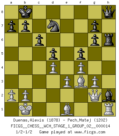 Last move : 1/2-1/2 2015 February 10 3:6:5 [Event "FICGS__CHESS__WCH_STAGE_1_GROUP_02__000014"] [Site "FICGS"] [Date "2014.11.01"] [Round "1"] [White "Duenas,Alexis"] [Black "Pech,Matej"] [Result "1/2-1/2"] [WhiteElo "1878"] [BlackElo "1202"] 1.d4 d5 2.c4 c6 3.e3 Bf5 4.Nc3 e6 5.Nf3 Nf6 6.Nh4 Be4 7.f3 Bg6 8.Nxg6 hxg6 9.Bd2 Bd6 10.Qb3 Bg3+ 11.Kd1 Qc7 12.Kc2 Rxh2 13.Rxh2 Bxh2 14.f4 Nbd7 15.Be2 O-O-O 16.Rh1 Rh8 17.Be1 Qd8 18.Kb1 dxc4 19.Qxc4 Nd5 20.Qd3 Rh6 21.Nxd5 exd5 22.g3 f5 23.Bf3 Kb8 24.Qe2 Qh8 25.Qg2 1/2-1/2 QGD Slav defense Queenside Castling by player Black (move 15) This chess game ended in a draw. Follow this game move after move (download)Castle early and often. (Rob Sillars) Je mehr wir mit Computern analysieren, desto mehr glauben wir an Verteidigung. (Vladimir Kramnik) Un entendimiento a fondo de las continuaciones típicas del mate, hace de las combinaciones de sacrificio mas complicadas conducirlas a ellas no solo sin dificultad, sino casi de una manera natural. (Siegbert Tarrasch) Un journaliste : 'Vous préférez avoir une dame de plus sur l'échiquier ou au lit ?' Boris Spassky : 'Ca dépend de la position.' Panic is a sudden desertion of us, an a going over to the enemy of our imagination. (Christian Nevell Bovee)