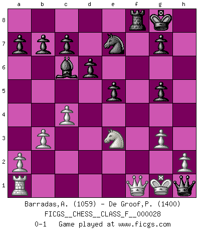 Last move : 0-1 2007 March 4 0:12:24 [Event "FICGS__CHESS__CLASS_F__000028"] [Site "FICGS"] [Date "2007.02.23"] [Round "1"] [White "Barradas,Anderson"] [Black "De Groof,Pieter"] [Result "0-1"] [WhiteElo "1059"] [BlackElo "1400"] 1.Nf3 f5 2.g3 Nf6 3.Bg2 e6 4.O-O Be7 5.d3 O-O 6.Nbd2 Nc6 7.e4 fxe4 8.dxe4 Qe8 9.Re1 e5 10.Nc4 d6 11.Bg5 Be6 12.Ne3 Nxe4 13.Bxe7 Nxe7 14.Nd2 Nxf2 15.Qc1 Nh3+ 16.Bxh3 Bxh3 17.Ne4 Qc6 18.Ng5 Bd7 19.Rf1 h6 20.Rxf8+ Rxf8 21.b3 hxg5 22.c4 Qf3 23.Qe1 Bc6 24.Qf1 Qh1+ 0-1 Reti v Dutch Kingside Castling by player White (move 4) Kingside Castling by player Black (move 5) Player Black won this chess game. Follow this game move after move (download)Chess is a foolish expedient for making idle people believe they are doing something very clever when they are only wasting their time. (George Bernard Shaw) Auf Remis zu spielen ist gewissermaßen ein Verbrechen gegen das Schachspiel. (Mikhail Nekhemyevich Tal) La caracteristica mas importante en la posición del Ajedrez es la actividad de las piezas. Esto es absolutamente fundamental en todas las fases del juego: Apertura, Juego Medio y especialmente Finales. La limitación primordial en la actividad de una pieza, es la estructuración de los Peones. (Michael Stean) Le pion, dans sa simplicité, marche droit devant lui, mais lorsqu'il prend, il le fait obliquement? Ainsi l'homme, tant qu'il reste pauvre, marche dans la droiture et vit honnêtement, mais lorsqu'il recherche les honneurs, il flatte, se parjure et, par les voies obliques, cherche une position supérieure sur l'échiquier du monde. (Jean de Galles) Everybody lies. (Gregory House, House M.D.)