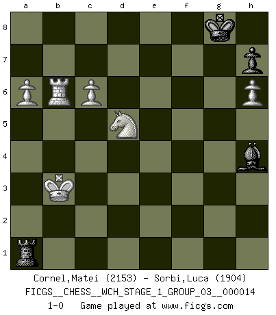 Last move : 1-0 2014 December 17 13:44:35 [Event "FICGS__CHESS__WCH_STAGE_1_GROUP_03__000014"] [Site "FICGS"] [Date "2014.11.01"] [Round "1"] [White "Cornel,Matei"] [Black "Sorbi,Luca"] [Result "1-0"] [WhiteElo "2153"] [BlackElo "1904"] 1.e4 c5 2.Nf3 d6 3.d4 cxd4 4.Nxd4 Nf6 5.Nc3 a6 6.f3 e5 7.Nb3 Be6 8.Be3 Be7 9.Qd2 O-O 10.O-O-O Nbd7 11.g4 b5 12.g5 b4 13.Ne2 Ne8 14.f4 a5 15.f5 Bc4 16.Kb1 a4 17.Nbc1 d5 18.Ng3 Nd6 19.f6 gxf6 20.gxf6 Nxf6 21.Bh6 Kh8 22.Qg5 Rg8 23.Qxe5 Ra5 24.Bf4 Re8 25.Bg5 a3 26.h4 dxe4 27.Bxf6+ Bxf6 28.Qxd6 Qxd6 29.Rxd6 Be5 30.Bxc4 Bxd6 31.Nb3 Ra7 32.Nf5 Bf8 33.Nbd4 axb2 34.Re1 Bc5 35.Nf3 f6 36.Bd3 e3 37.Kxb2 Bb6 38.N3d4 Bc5 39.Rf1 Rd7 40.Ne2 Rc7 41.Rg1 Ra7 42.Bc4 Bb6 43.Kb3 Rea8 44.Rg2 Bc5 45.h5 Rc8 46.Rg4 Ra3+ 47.Kb2 Ra7 48.Bb3 Re8 49.Nf4 Rc7 50.Bd5 Rd8 51.Bc4 Bd4+ 52.Kb3 Rdc8 53.Nd5 Rxc4 54.Nh6 Rf8 55.Kxc4 f5 56.Nxf5 e2 57.Re4 Bf2 58.Rxe2 Rxf5 59.h6 Rf8 60.Kxb4 Rb8+ 61.Kc4 Bh4 62.a4 Bg5 63.Re6 Kg8 64.a5 Rb2 65.a6 Ra2 66.Kb3 Ra1 67.c4 Kf7 68.Rb6 Kg8 69.c5 Bh4 70.c6 1-0 Sicilian : Najdorf Kingside Castling by player Black (move 9) Queenside Castling by player White (move 10) 10 pieces endgame at move 60 : White KRNPPP , Black KRBP WHITE : King + 1 Rook 1 Knight 3 Pawns BLACK : King + 1 Rook 1 Bishop 1 Pawn Player White won this chess game. Follow this game move after move (download)Even the laziest King flees wildly in the face of a double check ! (Aaron Nimzowitsch) Oft bringt ein stiller Zug das Erdbeben. (Richard Reti) Botvinnik trató de alejar el misterio referente al Ajedrez, siempre relacionandolo a situaciones de la vida diaria. Solía llamar al Ajedrez un problema inexacto típico, similar a aquellos en que la gente tiene siempre que resolver a cada día. (Garry Kasparov) Soyez une menace à chaque fois que vous vous asseyez pour jouer. (Ken Smith) Winning isn't everything... but losing is nothing. (Mednis)