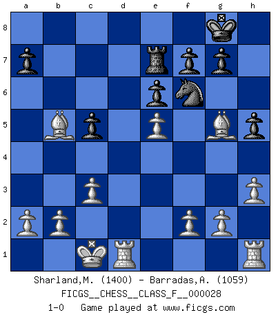 Last move : 1-0 2007 March 3 19:12:40 [Event "FICGS__CHESS__CLASS_F__000028"] [Site "FICGS"] [Date "2007.02.23"] [Round "1"] [White "Sharland,Michael"] [Black "Barradas,Anderson"] [Result "1-0"] [WhiteElo "1400"] [BlackElo "1059"] 1.e4 c5 2.Nf3 Nc6 3.d4 d6 4.d5 Ne5 5.Nxe5 dxe5 6.Qh5 Nf6 7.Qxe5 Ng4 8.Qg3 h5 9.h3 Nf6 10.Nc3 e6 11.Nb5 Qa5+ 12.c3 Rb8 13.Qxb8 Qd8 14.Bg5 Be7 15.d6 O-O 16.dxe7 Qxe7 17.e5 Bd7 18.Qxb7 Re8 19.O-O-O Bxb5 20.Qxe7 Rxe7 21.Bxb5 1-0 Sicilian defense Kingside Castling by player Black (move 15) Queenside Castling by player White (move 19) Player White won this chess game. Follow this game move after move (download)It is no time to be playing Chess when the house is on fire. (Italian Proverb) Die Partien sind immer verschieden, die Interviews immer die gleichen. (Garry Kasparov) Cuando tu casa esta en llamas, no puedes ser molestado por tus vecinos. O, como decinos en Ajedrez, si tu Rey esta bajo ataque, no te preocupa perder un Peón del lado de la Reina. (Gary Kasparov) Ce qui caractérise les parties de combat, c'est que si le défenseur a constamment de difficiles problèmes à résoudre, l'attaquant doit chercher sans relâche de nouvelles possibilités d'attaque. (Koblentz) The faster the computer, the slower the brain. (Thibault de Vassal)