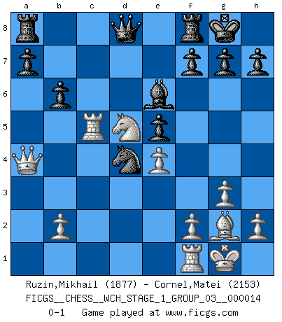 Last move : 0-1 2014 November 16 18:17:40 [Event "FICGS__CHESS__WCH_STAGE_1_GROUP_03__000014"] [Site "FICGS"] [Date "2014.11.01"] [Round "1"] [White "Ruzin,Mikhail"] [Black "Cornel,Matei"] [Result "0-1"] [WhiteElo "1877"] [BlackElo "2153"] 1.Nf3 d5 2.d4 Nf6 3.g3 c5 4.Bg2 cxd4 5.Nxd4 e5 6.Nb3 Be7 7.O-O Be6 8.c4 Nc6 9.cxd5 Nxd5 10.e4 Ndb4 11.Nc3 Nxa2 12.Nd5 Nxc1 13.Rxc1 O-O 14.Nc5 Bxc5 15.Rxc5 Nd4 16.Qa4 b6 0-1 Reti Opening Kingside Castling by player White (move 7) Kingside Castling by player Black (move 13) Player Black won this chess game. Follow this game move after move (download)Not only will I predict his triumph over Botvinnik, but I'll go further and say that he'll probably be the greatest Chess player that ever lived. (John Collins) Es genügt nicht ein guter Spieler zu sein, man muß auch gut spielen. (Siegbert Tarrasch) En la vida, como en el Ajedrez, los Peones propios obstruyen nuestro camino. La gran fortuna de un hombre, su comodidad, placer, hijos, libros, que deberían ayudarle a ganar, con mucha frecuencia lo ponen en Jaque Mate. (Charles Buxton) Aux échecs, l'amour-propre est satisfait quand on remporte la victoire, mais il n'y a pas de honte à être battu. (Benjamin Franklin) Every vice is only an exaggeration of a necessary and virtuous function. (Ralph Waldo Emerson, Journals 1936)