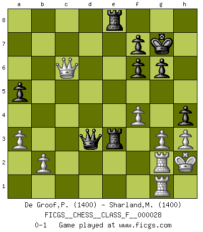Last move : 0-1 2007 March 30 19:35:43 [Event "FICGS__CHESS__CLASS_F__000028"] [Site "FICGS"] [Date "2007.02.23"] [Round "1"] [White "De Groof,Pieter"] [Black "Sharland,Michael"] [Result "0-1"] [WhiteElo "1400"] [BlackElo "1400"] 1.e4 c5 2.Nc3 Nc6 3.g3 g6 4.Bg2 Bg7 5.d3 d6 6.Be3 Nf6 7.h3 O-O 8.f4 Be6 9.Nge2 d5 10.e5 d4 11.exf6 Bxf6 12.Bd2 dxc3 13.Bxc3 Bd5 14.O-O Bxg2 15.Kxg2 Qd5+ 16.Kh2 Nd4 17.Nxd4 cxd4 18.Bb4 a5 19.c4 dxc3 20.Bxc3 Rfd8 21.Bxf6 exf6 22.Rf3 Re8 23.a3 Rac8 24.Rf2 Re3 25.Rd2 h5 26.Qh1 Qd4 27.Qxb7 Rce8 28.Rg1 h4 29.Rdg2 Qxd3 30.Qc6 Kg7 0-1 Sicilian : Closed, 6.Be3 Kingside Castling by player Black (move 7) Kingside Castling by player White (move 14) Player Black won this chess game. Follow this game move after move (download)Do you realize Fischer almost never has any bad pieces? He exchanges them, and the bad pieces remain with his opponents. (Yuri Balashov) Obwohl ich alt bin, darf mir niemand den Finger in den Mund stecken, sonst beisse ich. (Wilhelm Steinitz) El Ajedrez hace al hombre ser mas sabio y ver mas claro. (Vladimir Putin) On n'a jamais que l'âge auquel on a commence à jouer aux échecs car après on cesse de vieillir. (Capablanca) Heh, heh, heh. Time to abandon ship. (General Grievous in Star Wars ep.3)