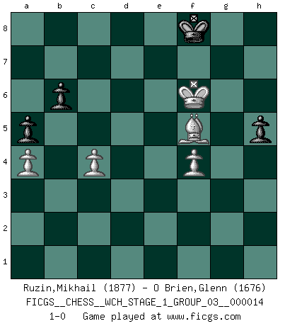 Last move : 1-0 2014 December 24 6:51:54 [Event "FICGS__CHESS__WCH_STAGE_1_GROUP_03__000014"] [Site "FICGS"] [Date "2014.11.01"] [Round "1"] [White "Ruzin,Mikhail"] [Black "O Brien,Glenn"] [Result "1-0"] [WhiteElo "1877"] [BlackElo "1676"] 1.e4 e5 2.Nf3 Nc6 3.Nc3 Nf6 4.Bb5 Nd4 5.Bc4 Bc5 6.Nxe5 Qe7 7.Nf3 d5 8.Bxd5 Bg4 9.d3 c6 10.Bb3 Nd7 11.Be3 Qf6 12.Bxd4 Bxd4 13.h3 Bxc3+ 14.bxc3 Qxc3+ 15.Ke2 Bxf3+ 16.gxf3 Qf6 17.Qd2 a5 18.a4 Nc5 19.Rab1 O-O 20.Rhg1 b6 21.d4 Nxe4 22.fxe4 Rad8 23.Rbd1 c5 24.Qg5 Qxg5 25.Rxg5 cxd4 26.Rd5 Rde8 27.R5xd4 Kh8 28.Kf1 f6 29.f3 f5 30.exf5 Rxf5 31.Kf2 Ref8 32.R1d3 g6 33.Rd7 Rf4 34.Rb7 R4f6 35.Bd5 Rc8 36.c4 Rf4 37.Kg3 Rf6 38.Re3 g5 39.Kg4 Rh6 40.Kxg5 Rxh3 41.Be6 Re8 42.Bxh3 Rxe3 43.Kf6 Re8 44.Kf7 Rg8 45.Re7 Rg7+ 46.Kf6 Rg6+ 47.Ke5 h5 48.Bf5 Rh6 49.Re6 Rxe6+ 50.Kxe6 Kg7 51.f4 Kf8 52.Kf6 1-0 Four knights : Rubinstein counter-gambit Kingside Castling by player Black (move 19) 10 pieces endgame at move 49 : White KBPPP , Black KRPPP WHITE : King + 1 Bishop 3 Pawns BLACK : King + 1 Rook 3 Pawns 9 pieces endgame at move 50 : White KBPPP , Black KPPP WHITE : King + 1 Bishop 3 Pawns BLACK : King + 3 Pawns Player White won this chess game. Follow this game move after move (download)Chess is a part of culture and if a culture is declining then Chess too will decline. (Mikhail Botvinnik) Das Schachspiel hat wie die Liebe, die Musik, die Fähigkeit, den Menschen glücklich zu machen. Ich habe ein leises Gefühl des Bedauerns für jeden, der das Schachspiel nicht kennt, so wie ich jeden bedaure, der die Liebe nicht kennt. (Siegbert Tarrasch) El Ajedrez es un regaderazo frío para la mente. (Sir John Simon) Les échecs sont utiles à l'exercice de la faculté de penser et à celle de l'imagination. Car nous devons posséder une méthode élaborée pour atteindre des buts partout où nous devons conduire notre raison. (Leibnitz) Hold em is to stud what chess is to checkers. (Johnny Moss)