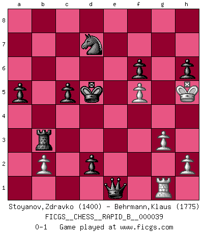 Last move : 0-1 2007 May 14 18:56:2 [Event "FICGS__CHESS__RAPID_B__000039"] [Site "FICGS"] [Date "2007.02.23"] [Round "1"] [White "Stoyanov,Zdravko"] [Black "Behrmann,Klaus"] [Result "0-1"] [WhiteElo "1400"] [BlackElo "1775"] 1.e4 c6 2.Nf3 d5 3.e5 d4 4.Bc4 Bf5 5.Ng5 e6 6.d3 Qa5+ 7.Bd2 Qxe5+ 8.Qe2 Qxe2+ 9.Kxe2 Nd7 10.Re1 b5 11.Bb3 Nc5 12.Kf1 a5 13.a3 Nxb3 14.cxb3 Bxd3+ 15.Kg1 Bd6 16.Nf3 c5 17.Bg5 h6 18.Bh4 g5 19.Bg3 Bxg3 20.fxg3 g4 21.Nbd2 gxf3 22.gxf3 Ke7 23.a4 Nf6 24.Re5 Nd7 25.R5e1 Rhb8 26.axb5 Rxb5 27.Kf2 Kd6 28.f4 f6 29.Ra3 e5 30.Ne4+ Bxe4 31.Rxe4 Kd5 32.Kf3 Rab8 33.Re2 Rxb3+ 34.Rxb3 Rxb3+ 35.Kg4 d3 36.Rd2 e4 37.f5 e3 38.Rg2 d2 39.Rg1 e2 40.Kh5 e1Q 0-1 Caro-Kann defense Promotion Queen by player Black (move 40) Player Black won this chess game. Follow this game move after move (download)I play correspondence chess because it is both art and science while chess is art only. (A player at FICGS) Ich verstehe mehr vom Schach als irgendein anderer lebender Meister. (José Raúl Capablanca) ¿Esta Bobby Fischer algo cuerdo?. (Salo Flohr) Même si l'adversaire joue le coup analysé précédemment, recommencez l'analyse en voyant la nouvelle position. Première règle de Blumenfeld A good aphorism is too hard for the tooth of time, and is not worn away with the centuries, although it serves as food for every speech. (Friedrich Nietzsche)