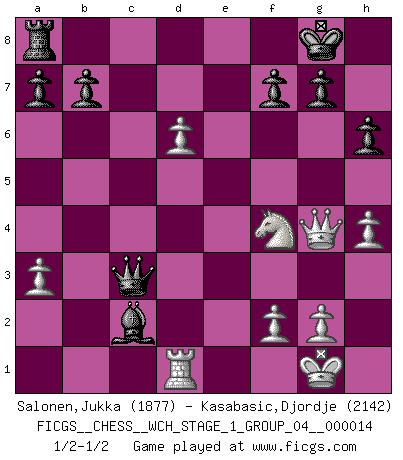 Last move : 1/2-1/2 2015 January 2 18:44:2 [Event "FICGS__CHESS__WCH_STAGE_1_GROUP_04__000014"] [Site "FICGS"] [Date "2014.11.01"] [Round "1"] [White "Salonen,Jukka"] [Black "Kasabasic,Djordje"] [Result "1/2-1/2"] [WhiteElo "1877"] [BlackElo "2142"] 1.e4 e5 2.Nf3 Nf6 3.Nxe5 d6 4.Nf3 Nxe4 5.d4 d5 6.Bd3 Nc6 7.O-O Be7 8.c4 Nb4 9.Be2 O-O 10.Nc3 Bf5 11.a3 Nxc3 12.bxc3 Nc6 13.Re1 Re8 14.Bf4 dxc4 15.Bxc4 Bd6 16.Rxe8+ Qxe8 17.Ng5 Bg6 18.Bxd6 cxd6 19.h4 Qe7 20.Qg4 h6 21.Nh3 Qe4 22.Nf4 Ne5 23.dxe5 Qxc4 24.exd6 Qxc3 25.Rf1 Be4 26.Rd1 Bc2 1/2-1/2 Petrov : Classical attack Kingside Castling by player White (move 7) Kingside Castling by player Black (move 9) This chess game ended in a draw. Follow this game move after move (download)Morphy was probably the greatest genius of them all. (Bobby Fischer) Wie gewinnt Tal? Er entwickelt alle seine Figuren in die Brettmitte und opfert sie dann irgendwo. (Robert James Fischer) Siempre es mejor sacrificar los hombres de tu oponente. (Savielly Tartakower) La vérité est comme le meilleur coup aux échecs : elle existe, mais il faut la chercher. (Arturo Perez-Reverte) Better than a thousand days of diligent study is one day with a great teacher. (Japanese proverb)