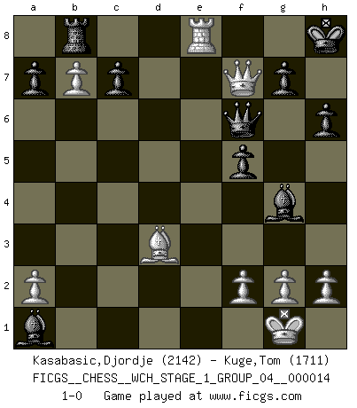 Last move : 1-0 2014 December 17 11:4:34 [Event "FICGS__CHESS__WCH_STAGE_1_GROUP_04__000014"] [Site "FICGS"] [Date "2014.11.01"] [Round "1"] [White "Kasabasic,Djordje"] [Black "Kuge,Tom"] [Result "1-0"] [WhiteElo "2142"] [BlackElo "1711"] 1.e4 e5 2.Nf3 Nf6 3.Nxe5 d6 4.Nf3 Nxe4 5.d4 Bg4 6.Bd3 d5 7.O-O Nc6 8.Re1 f5 9.c4 Bb4 10.Nc3 O-O 11.cxd5 Nxc3 12.bxc3 Bxc3 13.dxc6 Bxa1 14.cxb7 Rb8 15.Qb3+ Kh8 16.Bg5 Qd7 17.Ne5 Qxd4 18.Nf7+ Rxf7 19.Qxf7 h6 20.Bf6 Qxf6 21.Re8+ 1-0 Petrov : Classical attack Kingside Castling by player White (move 7) Kingside Castling by player Black (move 10) Player White won this chess game. Follow this game move after move (download)Pawns are born free, yet they are everywhere in chains. (Rick Kennedy) Gott hat gewollt, dass ich Champion werde. (Surab Azmajparaschvili) Nunca nadie ha ganado una partida de Ajedrez rindiendose. (Unknown) Nous sommes les pions de la mystérieuse partie d'Echecs jouée par Dieu. Il nous déplace, nous arrête, nous pousse encore, puis nous lance un à un dans la boîte du Néant. Epitaphe sur la tombe de David Janowsky (1868-1927). Humor is by far the most significant activity of the human brain. (Edward De Bono)