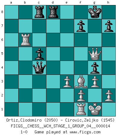 Last move : 1-0 2015 January 2 3:47:42 [Event "FICGS__CHESS__WCH_STAGE_1_GROUP_04__000014"] [Site "FICGS"] [Date "2014.11.01"] [Round "1"] [White "Ortiz,Clodomiro"] [Black "Cirovic,Zeljko"] [Result "1-0"] [WhiteElo "2050"] [BlackElo "1545"] 1.c4 e5 2.Nc3 c5 3.Nf3 Nc6 4.g3 d6 5.Bg2 Bf5 6.d3 Nf6 7.a3 Nd4 8.b4 Rc8 9.bxc5 dxc5 10.Rb1 Nxf3+ 11.Bxf3 b6 12.Nb5 Qd7 13.Qa4 e4 14.dxe4 Nxe4 15.Rb3 Nd6 16.Re3+ Be6 17.Rd3 Be7 18.Bf4 O-O 19.Bxd6 Bxd6 20.Rxd6 Qe8 21.Qxa7 Bxc4 22.a4 Bxb5 23.axb5 Qxb5 24.Rxb6 Qc4 25.O-O Rfd8 26.e3 g5 27.Qe7 g4 28.Qg5+ 1-0 This chess game has been lost on time (started : 2014.11.01 20:43:12) English Opening Kingside Castling by player Black (move 18) Kingside Castling by player White (move 25) Player White won this chess game. Follow this game move after move (download)Pawns: they are the soul of this game, they alone form the attack and defense. (Philidor) Im Spitzenschach von heute geht es nur um Vorbereitung, um tiefgründige, sorgfältige Eröffnungsvorbereitung. (Nigel Short) La mitad de las variaciones que son calculadas en una partida de torneo, resultan ser completamente superfluas. Desafortunadamente, nadie sabe por adelantado cual mitad. (Jan Tinman) Seul un grand joueur sait à quel point il joue faiblement. (Xavier Tartacover) I don't know, I don't care, and it doesn't make any difference. (Albert Einstein)