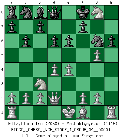 Last move : 1-0 2014 November 10 14:12:26 [Event "FICGS__CHESS__WCH_STAGE_1_GROUP_04__000014"] [Site "FICGS"] [Date "2014.11.01"] [Round "1"] [White "Ortiz,Clodomiro"] [Black "Mathakiya,Azaz"] [Result "1-0"] [WhiteElo "2050"] [BlackElo "1115"] 1.d4 e6 2.e4 d6 3.Nf3 g6 4.Nc3 b6 5.Bg5 Ne7 6.Bf6 Rg8 7.Ng5 h6 8.Nh7 Bg7 9.Qd2 g5 10.h4 Bxf6 11.Nxf6+ Kf8 12.hxg5 Ng6 13.Nxg8 1-0 Queen's pawn Player White won this chess game. Follow this game move after move (download)He who fears an isolated Queen's Pawn should give up Chess. (Siegbert Tarrasch) Ein typischer, sehr verbreiteter Gedankenschädling ist der, daß der betreffende Amateur von der Annanhme ausgeht, daß jeder einzelne Zug etwas zu leisten habe. (Aaron Nimzowitsch) El hombre es un frívolo, una creatura engañosa y como un jugador de Ajedrez, se preocupa mas por el proceso de obtener su meta que de la meta por sí misma. (Dostoyevsky) Des idées, des idées, j'en ai cent, j'en ai mille. Des bonnes, des mauvaises, applicables, irréalisables... Il suffit de faire le tri ! (Roos) If you know the enemy and know yourself you need not fear the results of a hundred battles. (Sun Tzu)