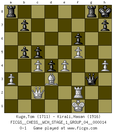 Last move : 0-1 2014 November 12 0:4:21 [Event "FICGS__CHESS__WCH_STAGE_1_GROUP_04__000014"] [Site "FICGS"] [Date "2014.11.01"] [Round "1"] [White "Kuge,Tom"] [Black "Kirali,Hasan"] [Result "0-1"] [WhiteElo "1711"] [BlackElo "1916"] 1.e4 c5 2.a3 Nc6 3.b4 e5 4.b5 Nd4 5.c3 Ne6 6.Nf3 d5 7.exd5 Qxd5 8.d3 Be7 9.c4 Qd7 10.Nc3 Bd8 11.Be2 Nf6 12.O-O O-O 13.Bb2 Bc7 14.Re1 Nd4 15.Bf1 Qf5 16.Ne4 Nxe4 17.dxe4 Qf6 18.Nxd4 exd4 19.Be2 Qd6 20.g3 Ba5 21.Rf1 Bh3 22.f4 Bxf1 23.Qxf1 f6 24.Bd3 Bc3 25.Ra2 Bd2 26.Bc1 Be3+ 27.Kg2 g5 28.f5 Rfe8 29.Re2 Bxc1 30.Qxc1 a6 31.h4 gxh4 32.gxh4 Kh8 33.Rf2 Rg8+ 34.Kf1 Qg3 35.Qc2 axb5 0-1 Sicilian defense Kingside Castling by player White (move 12) Kingside Castling by player Black (move 12) Player Black won this chess game. Follow this game move after move (download)Chess is so inspiring that I do not believe a good player is capable of having an evil thought during the game. (Wilhelm Steinitz) Der Knackpunkt bei der Konzentration ist, daß wir nur durch sie etwas Neues und Ungewöhnliches am Schachbrett finden können. Sie ist der einzige Weg durch neue neue Ideen eine Überraschung zu bereiten. (Garry Kasparov) Una compensación adecuada por un sacrificio es tener una combinación sólida que conduce a una posición ganadora; una compensación adecuada por una metida de pata es dejar a tu oponente arrebatar una derrota de las fauces de la victoria. (Bruce A. Moon) Un millionnaire : 'Monsieur Steinitz ! Vous ne participez aux tournois que pour l'argent, alors que moi je n'y viens que pour l'honneur.' Steinitz : 'Chacun joue pour ce qu'il n'a pas'... Remember : Your focus determines your reality. (Qui-Gon Jinn in Star Wars ep.1)