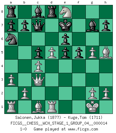 Last move : 1-0 2014 November 18 21:40:2 [Event "FICGS__CHESS__WCH_STAGE_1_GROUP_04__000014"] [Site "FICGS"] [Date "2014.11.01"] [Round "1"] [White "Salonen,Jukka"] [Black "Kuge,Tom"] [Result "1-0"] [WhiteElo "1877"] [BlackElo "1711"] 1.d4 Nf6 2.c4 c5 3.d5 Ne4 4.Qc2 Qa5+ 5.Nd2 f5 6.f3 Nd6 7.e4 e6 8.e5 Nf7 9.f4 d6 10.Ngf3 g5 11.Nxg5 Nxg5 12.fxg5 dxe5 13.Be2 Na6 14.O-O Nb4 15.Qc3 Bg7 16.Bh5+ Kf8 17.Ne4 Ke7 18.Nf6 Qc7 19.a3 Na6 20.Rd1 Rd8 21.Ne8 1-0 Vulture defense Kingside Castling by player White (move 14) Player White won this chess game. Follow this game move after move (download)All Chess players should have a hobby. (Savielly Tartakower) Schach ist Leben. (Robert James Fischer) La única cosa que los jugadores de Ajedrez tienen en común, es el Ajedrez. (Lodewijk Prins) Mais n'est-ce pas déjà le limiter injurieusement que d'appeler les échecs un jeu? N'est-ce pas aussi une science, un art, ou quelque chose qui, comme le cercueil de Mahomet entre ciel et terre, est suspendu entre l'un et l'autre, et qui réunit un nombre incroyable de contraires ? (Stefan Zweig) To err is human, but to really foul things up requires a computer. (Farmer's Almanac, 1978)
