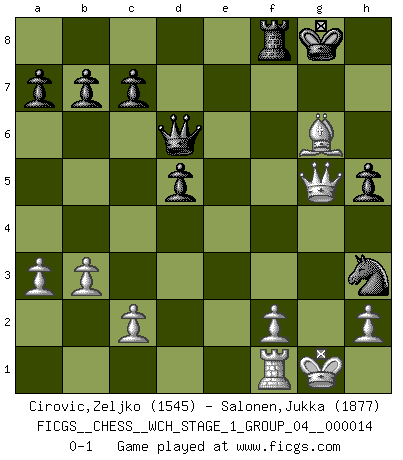 Last move : 0-1 2014 December 31 20:18:11 [Event "FICGS__CHESS__WCH_STAGE_1_GROUP_04__000014"] [Site "FICGS"] [Date "2014.11.01"] [Round "1"] [White "Cirovic,Zeljko"] [Black "Salonen,Jukka"] [Result "0-1"] [WhiteElo "1545"] [BlackElo "1877"] 1.e4 e5 2.Nf3 Nc6 3.b3 Nf6 4.d4 Nxe4 5.dxe5 Bb4+ 6.Bd2 Nxd2 7.Nbxd2 O-O 8.Bd3 d5 9.a3 Bc3 10.Rb1 Bg4 11.O-O Bxd2 12.Qxd2 Bxf3 13.gxf3 Nxe5 14.Qf4 Qd6 15.Rbe1 Rae8 16.Qg3 f5 17.f4 Ng6 18.Rxe8 Rxe8 19.Bxf5 Nxf4 20.Qh4 g6 21.Qg4 h5 22.Qg5 Rf8 23.Bxg6 Nh3+ 0-1 King's pawn game Kingside Castling by player Black (move 7) Kingside Castling by player White (move 11) Player Black won this chess game. Follow this game move after move (download)There must have been a time when men were demigods, or they could not have invented Chess. (Gustav Schenk) Es genügt nicht ein guter Spieler zu sein, man muß auch gut spielen. (Siegbert Tarrasch) El Ajedrez tiene tanto misterio como las mujeres. (Purdy) Même si vous avez un bon coup à faire, regardez toujours s'il n'y en a pas un qui lui soit préférable. (Pedro Damiano) For peace of mind, resign as general manager of the universe. (Douglas Adams)