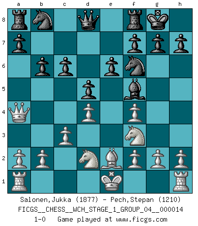 Last move : 1-0 2014 December 15 13:47:8 [Event "FICGS__CHESS__WCH_STAGE_1_GROUP_04__000014"] [Site "FICGS"] [Date "2014.11.01"] [Round "1"] [White "Salonen,Jukka"] [Black "Pech,Stepan"] [Result "1-0"] [WhiteElo "1877"] [BlackElo "1210"] 1.d4 d5 2.Bf4 Nf6 3.c3 Bf5 4.Qb3 b6 5.Nf3 e6 6.e3 Bd6 7.Qa4+ c6 8.Nbd2 O-O 9.Be2 Bxf4 10.exf4 1-0 This chess game has been lost on time (started : 2014.11.01 20:43:12) Queen's pawn, Mason variation Kingside Castling by player Black (move 8) Player White won this chess game. Follow this game move after move (download)In complicated positions, Bobby Fischer hardly had to be afraid of anybody. (Paul Keres) Je mehr ich von der FIDE weiss, um so weniger verstehe ich. (Alexander Kalifman) Mi estilo es algo parecido entre un poco de Tal y Petrosian. (Reshevsky) Les écrivains ont utilisé les échecs pour analyser les côtés extrêmes de la nature humaine. Dans ce cadre, les échecs offrent un champ d'expérimentation idéal. Mais on pourrait faire la même chose avec la peinture. Et là, en vous référant à Van Gogh, vous ne tirerez pas de conclusion définitive sur les peintres. (Gary Kasparov) Thibault, I ask for draw. Game 13876. - Sorry Ilmars, you won. (FICGS chat)