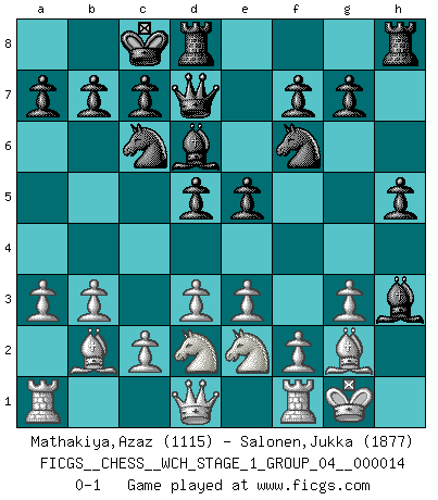 Last move : 0-1 2014 November 12 12:37:12 [Event "FICGS__CHESS__WCH_STAGE_1_GROUP_04__000014"] [Site "FICGS"] [Date "2014.11.01"] [Round "1"] [White "Mathakiya,Azaz"] [Black "Salonen,Jukka"] [Result "0-1"] [WhiteElo "1115"] [BlackElo "1877"] 1.e3 e5 2.d3 d5 3.g3 Nc6 4.Bg2 Nf6 5.b3 Bg4 6.Ne2 Qd7 7.h3 Be6 8.Bb2 O-O-O 9.Nd2 Bd6 10.a3 h5 11.O-O Bxh3 0-1 Van't Kruijs Opening Queenside Castling by player Black (move 8) Kingside Castling by player White (move 11) Player Black won this chess game. Follow this game move after move (download)My style is somewhere between that of Tal and Petrosian. (Reshevsky) Moralische Siege zählen nicht. (Savielly Grigorievitsch Tartakower) Solo el jugador con la iniciativa tiene el derecho a atacar. (Wilhelm Steinitz) Nous vivons dans un monde échiquéen : chaque jour qui passe est un défi à relever. (Philosophe Sasha) I teach you to lie, cheat and steal, and as soon as my back's turned you wait in line ? (Gregory House, House M.D.)