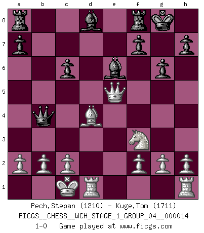 Last move : 1-0 2014 December 28 4:36:22 [Event "FICGS__CHESS__WCH_STAGE_1_GROUP_04__000014"] [Site "FICGS"] [Date "2014.11.01"] [Round "1"] [White "Pech,Stepan"] [Black "Kuge,Tom"] [Result "1-0"] [WhiteElo "1210"] [BlackElo "1711"] 1.e4 e5 2.Nf3 Nf6 3.d4 exd4 4.e5 Ne4 5.Qxd4 d5 6.exd6 Nxd6 7.Nc3 Nc6 8.Qf4 Be7 9.Bd3 Be6 10.Be3 Bf6 11.O-O-O O-O 12.Ne4 Nxe4 13.Bxe4 Qe7 14.Bxc6 bxc6 15.Bd4 Qb4 16.Qxc7 Bd8 17.Qg3 g6 18.Qe5 1-0 Petrov : Modern attack, Main line Queenside Castling by player White (move 11) Kingside Castling by player Black (move 11) Player White won this chess game. Follow this game move after move (download)I'm not afraid of Spassky. The world knows I'm the best. You don't need a match to prove it. (Bobby Fischer) Ohne Fehler kann es keine Brillanz geben. (Emanuel Lasker) Aunque la mayoría de la gente disfruta observar las partidas de los grandes Maestros de ataque, algunos de los jugadores mas notables en la historia han sido los jugadores silenciosos posicionales. Lentamente ellos te aplastan despojandote de tu espacio, congestionando tus piezas y dejandote virtualmente sin nada que hacer. (Yasser Seirawan) Les réformistes prétendent que les progrès de la théorie conduiront à la disparition des échecs, et qu'il faut, pour leur rendre vie, en remanier les règles. En réalité, qu'exprime cette affirmation? Le mépris de l'intuition, de l'imagination et de tous les autres éléments qui font des échecs un art. (Alexander Alekhine) This is where the fun begins. (Anakin Skywalker in Star Wars ep.3)