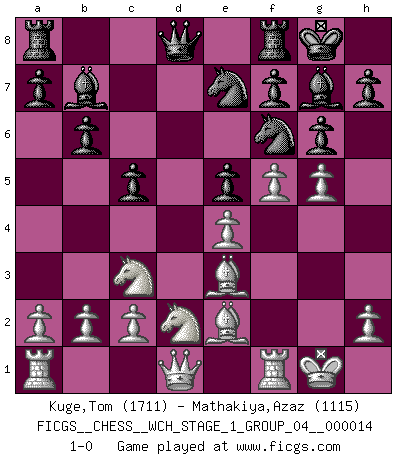 Last move : 1-0 2014 November 10 18:17:33 [Event "FICGS__CHESS__WCH_STAGE_1_GROUP_04__000014"] [Site "FICGS"] [Date "2014.11.01"] [Round "1"] [White "Kuge,Tom"] [Black "Mathakiya,Azaz"] [Result "1-0"] [WhiteElo "1711"] [BlackElo "1115"] 1.d4 e6 2.e3 d6 3.Be2 Nd7 4.Nc3 b6 5.e4 Ne7 6.f4 Bb7 7.Nf3 g6 8.Be3 Bg7 9.g4 e5 10.dxe5 dxe5 11.f5 O-O 12.O-O Nf6 13.Nd2 c5 14.g5 1-0 Queen's pawn Kingside Castling by player Black (move 11) Kingside Castling by player White (move 12) Player White won this chess game. Follow this game move after move (download)My God, Bobby Fischer plays so simply. (Alexei Suetin) Auf jeden Fall musst du zuerst Rechtsanwalt werden, damit du deine eigenen Interessen und die deiner Familie vertreten kannst. [Brief an seinen Sohn] (José Raúl Capablanca) Fischer es el jugador mas fuerte del mundo. De hecho, el jugador mas fuerte que jamas haya existido. (Larry Evans) Le profane ne songe pas à la somme de jouissance dont il se prive, qui méconnaît ce jeu aux ressources aussi variées que passionnantes. (Jean-Marie Jeanton-Lamarche) He who is a good ruler must first have been ruled. (Aristotle)