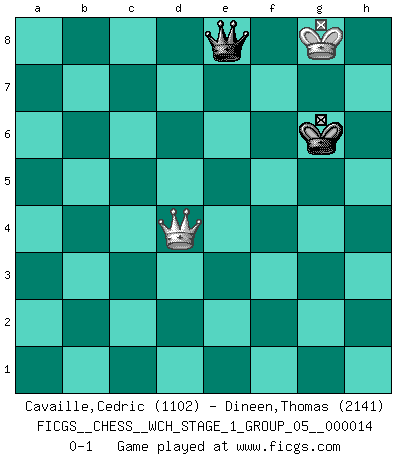 Last move : 0-1 2014 December 8 19:41:55 [Event "FICGS__CHESS__WCH_STAGE_1_GROUP_05__000014"] [Site "FICGS"] [Date "2014.11.01"] [Round "1"] [White "Cavaille,Cedric"] [Black "Dineen,Thomas"] [Result "0-1"] [WhiteElo "1102"] [BlackElo "2141"] 1.d4 Nf6 2.c4 g6 3.Nf3 Bg7 4.e3 O-O 5.Be2 c5 6.O-O cxd4 7.exd4 d5 8.Nc3 Nc6 9.Bg5 Be6 10.Qd2 dxc4 11.Bxf6 Bxf6 12.Rfd1 Bg4 13.d5 Bxf3 14.dxc6 Qxd2 15.Rxd2 Bxc6 16.Bxc4 Rfd8 17.Rad1 Rxd2 18.Rxd2 Rc8 19.h3 Bxg2 20.Bxf7+ Kxf7 21.Kxg2 Bxc3 22.bxc3 Rxc3 23.Rd7 Ra3 24.Rxb7 Rxa2 25.Kg3 a5 26.Ra7 a4 27.f4 a3 28.h4 Ke6 29.Ra6+ Kd5 30.Ra5+ Kc4 31.Ra7 Rd2 32.Rxa3 Rd3+ 33.Rxd3 Kxd3 34.Kg4 Ke4 35.Kg5 h5 36.Kxg6 Kxf4 37.Kxh5 Kf5 38.Kh6 e5 39.h5 e4 40.Kg7 e3 41.h6 e2 42.h7 e1Q 43.h8Q Qe7+ 44.Kg8 Kg6 45.Qd4 Qe8+ 0-1 King's Indian, 3.Nf3 Kingside Castling by player Black (move 4) Kingside Castling by player White (move 6) 10 pieces endgame at move 24 : White KRPP , Black KRPPPP WHITE : King + 1 Rook 2 Pawns BLACK : King + 1 Rook 4 Pawns 9 pieces endgame at move 32 : White KRPP , Black KRPPP WHITE : King + 1 Rook 2 Pawns BLACK : King + 1 Rook 3 Pawns 8 pieces endgame at move 33 : White KRPP , Black KPPP WHITE : King + 1 Rook 2 Pawns BLACK : King + 3 Pawns 7 pieces endgame at move 33 : White KPP , Black KPPP WHITE : King + 2 Pawns BLACK : King + 3 Pawns 6 pieces endgame at move 36 : White KPP , Black KPP WHITE : King + 2 Pawns BLACK : King + 2 Pawns 5 pieces endgame at move 36 : White KP , Black KPP WHITE : King + 1 Pawn BLACK : King + 2 Pawns 4 pieces endgame at move 37 : White KP , Black KP WHITE : King + 1 Pawn BLACK : King + 1 Pawn Promotion Queen by player Black (move 42) Promotion Queen by player White (move 43) Player Black won this chess game. Follow this game move after move (download)In life, as in Chess, one's own Pawns block one's way. A man's very wealth, ease, leisure, children, books, which should help him to win, more often checkmate him. (Charles Buxton) Unter Putin wird alles Geld aus Russland wie von einem Staubsauger nach Moskau umgeleitet, das ist wie ein schwarzes Loch. (Garry Kasparov) El Ajedrez expande y enriquece tu mente. (Saudin Robovic) Le jeu d'échecs fait naître et fortifie en nous plusieurs qualités précieuses dans le cours de l'existence, telles que la prévoyance, la circonspection, la prudence, et la persévérance. (Benjamin Franklin - 1783, la morale des échecs) Do you know these so called Volunteers don't even get paid! (Simpsons)