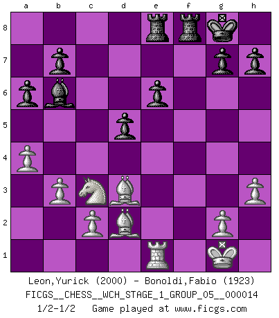 Last move : 1/2-1/2 2015 January 9 16:25:8 [Event "FICGS__CHESS__WCH_STAGE_1_GROUP_05__000014"] [Site "FICGS"] [Date "2014.11.01"] [Round "1"] [White "Leon,Yurick"] [Black "Bonoldi,Fabio"] [Result "1/2-1/2"] [WhiteElo "2000"] [BlackElo "1923"] 1.e4 d6 2.d4 Nf6 3.Nc3 c6 4.f4 Qa5 5.Bd3 e5 6.Nf3 Bg4 7.Be3 Nbd7 8.O-O Be7 9.h3 exf4 10.Bxf4 Bh5 11.a4 O-O 12.Qe1 Bxf3 13.Rxf3 Rae8 14.Qf2 Qb6 15.Bf1 a6 16.b3 Qd8 17.Re1 c5 18.dxc5 Nxc5 19.Bc4 Ne6 20.Be3 Qa5 21.Bd2 Qc5 22.Be3 Qe5 23.Qd2 Bd8 24.Rf5 Nxe4 25.Rxe5 Nxd2 26.Rxe6 fxe6 27.Bxd2 Bb6+ 28.Kh2 d5 29.Bd3 Bc7+ 30.Kg1 Bb6+ 1/2-1/2 Pirc : Ufimtsev-Pytel variation Kingside Castling by player White (move 8) Kingside Castling by player Black (move 11) This chess game ended in a draw. Follow this game move after move (download)What is the difference between chess and football? Everybody understands football, but nobody plays it. Everybody plays chess, but nobody understands it. Everything is relative. (Vladimir Kramnik) Später, ... hatte ich zunehmend Erfolg in entscheidenden Partien. Vielleicht weil ich eine einfache Wahrheit erkannte: nicht nur ich hatte Angst, auch mein Gegner. (Mikhail Nekhemyevich Tal) El Ajedrez es como la guerra en un tablero. (Bobby Fischer) Avant la finale, les dieux ont créé le milieu de partie. (Tarrasch) Beep ! (R2D2 in Star Wars ep.3)